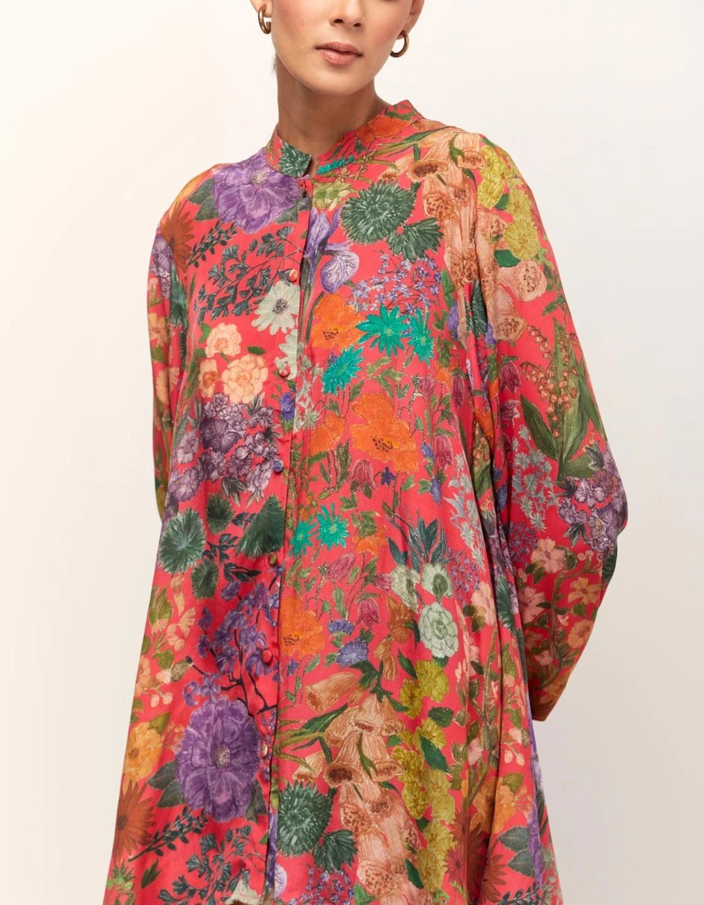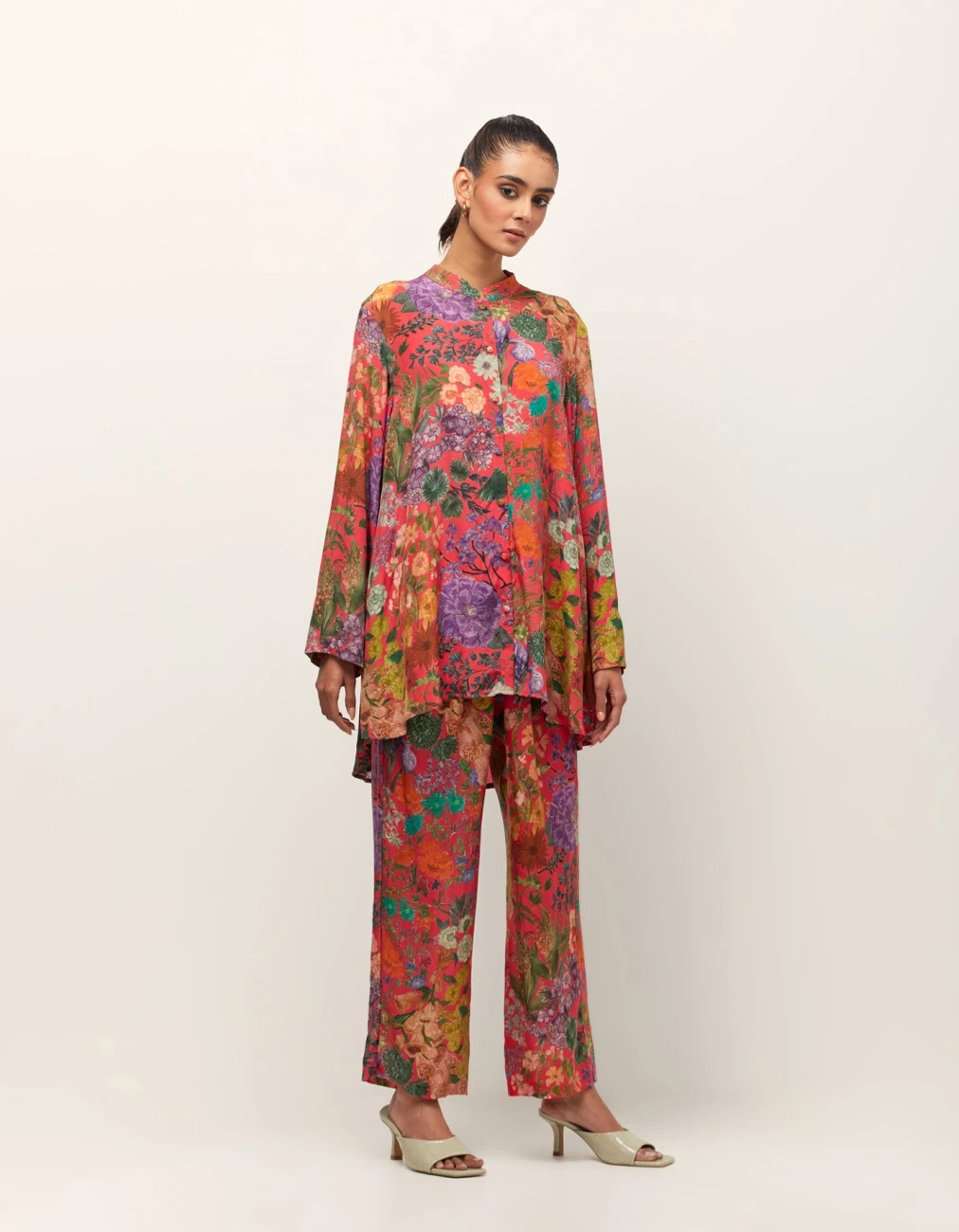 crepe - A full sleeve asymetrical flared bottom top with chinese collar, print inspired from the kashimr