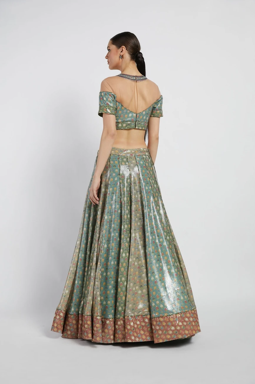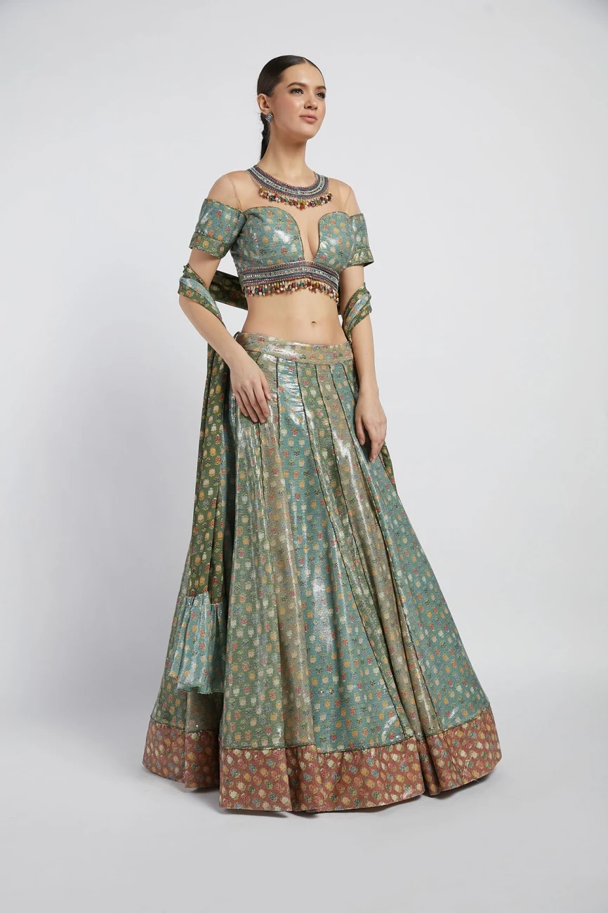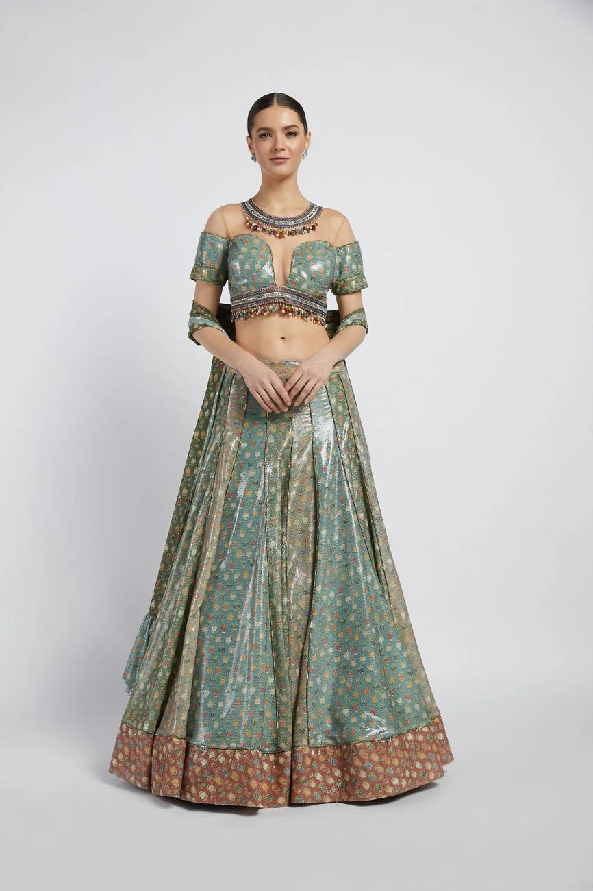 - Fully sheeted gorgette lehenga and blouse with blouse with sequins, pearls , beads drops etc