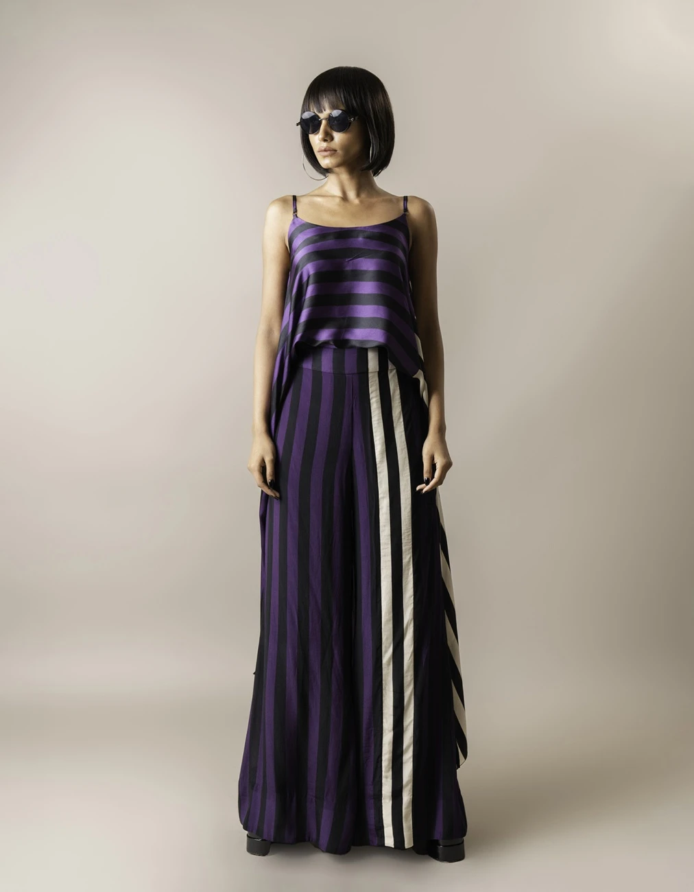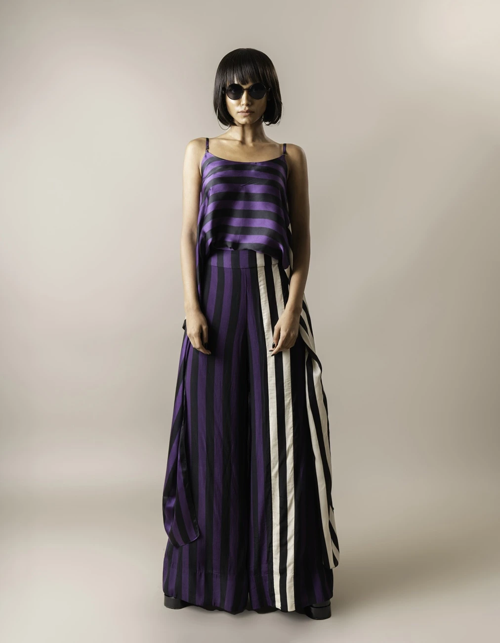 - Aubergine Stripes Print On Satin Strappy Singlet Top With Crepe A-Line Pants
