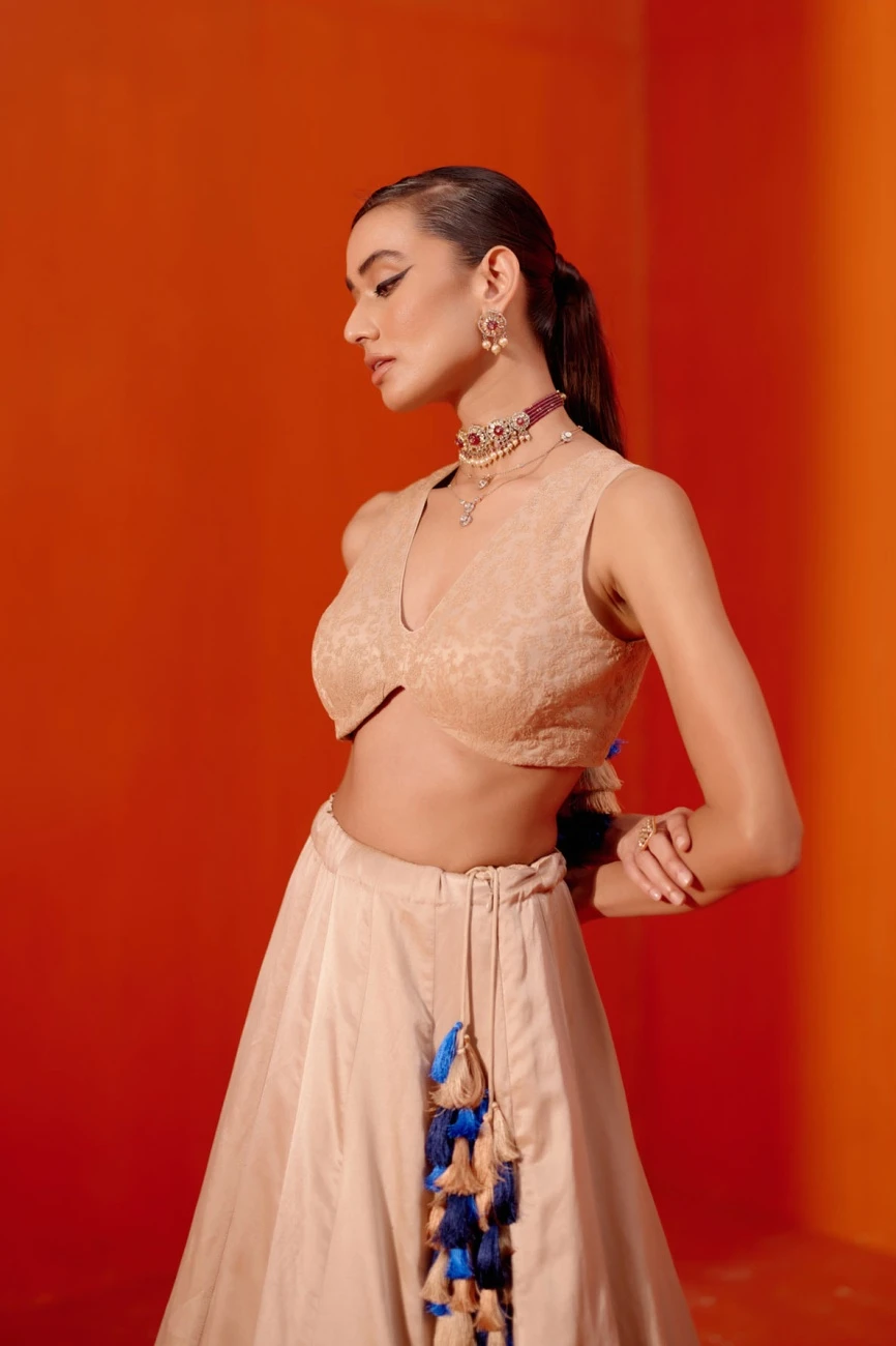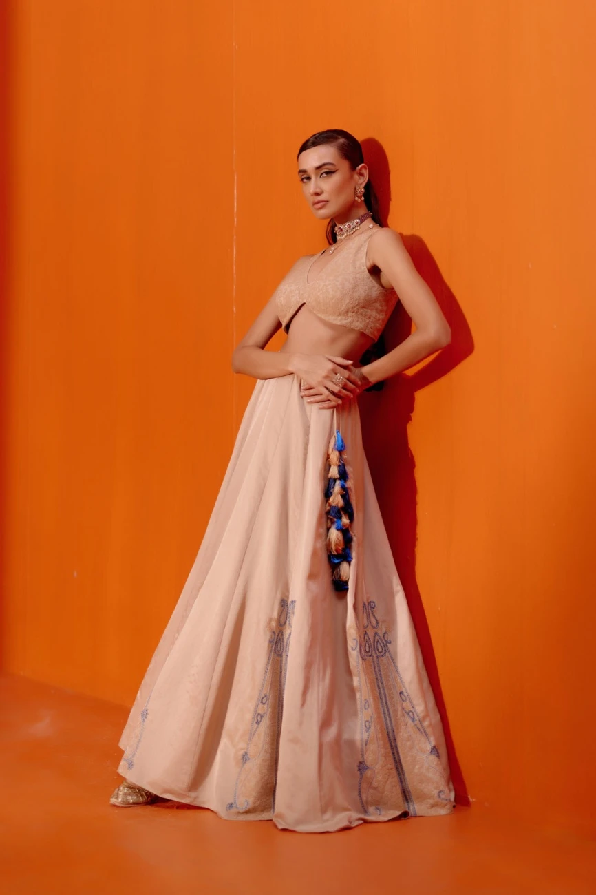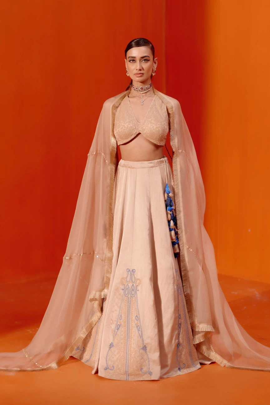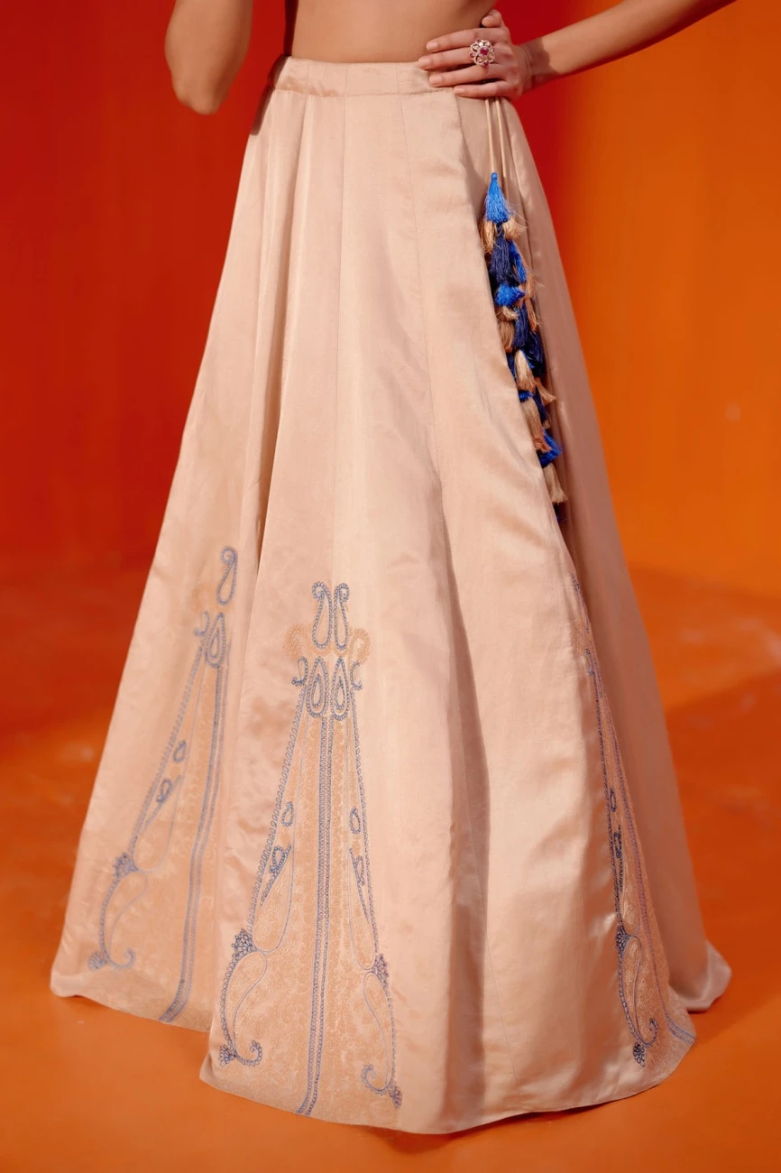 - The beige cotton silk satin lehenga features exquisite dori embroidery in contrasting colours
