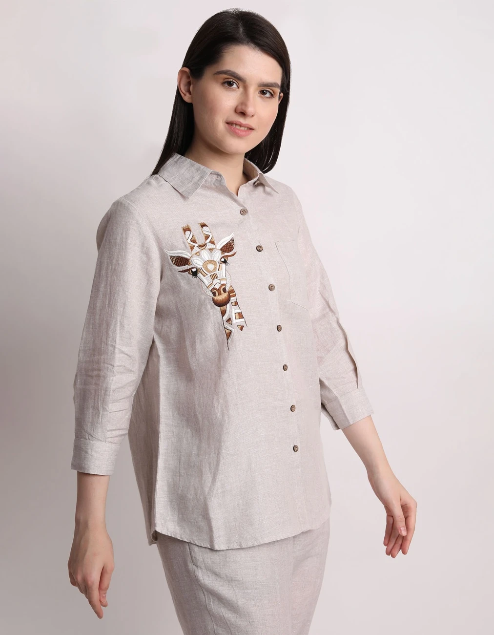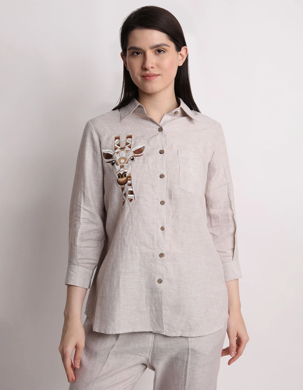 - Beige Giraffe Embroidery Shirt