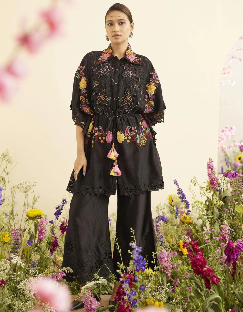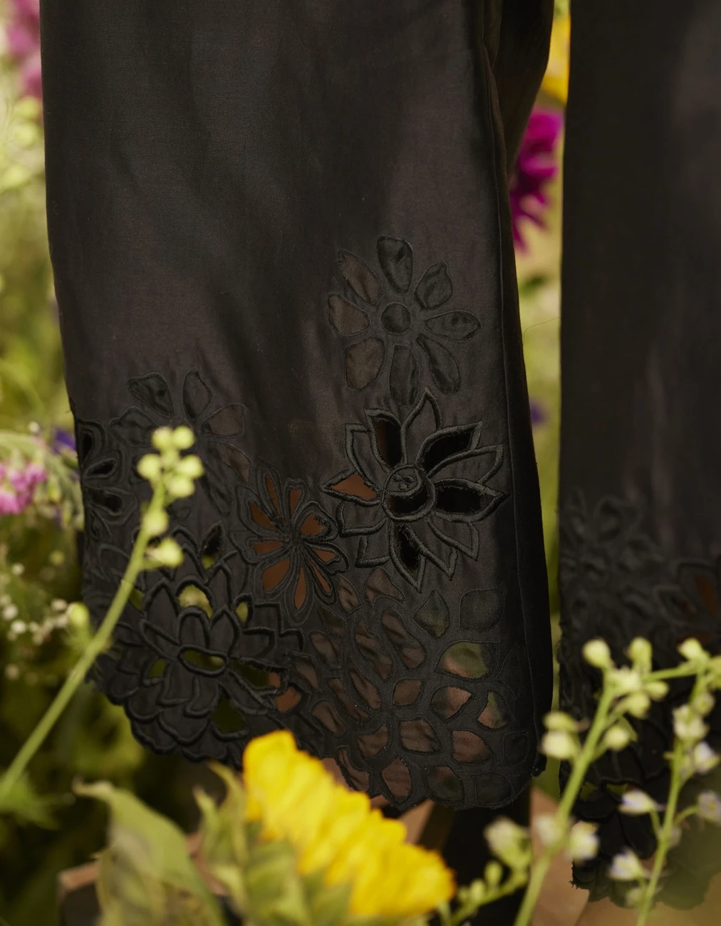 - Black chanderi cutwork culottes pants