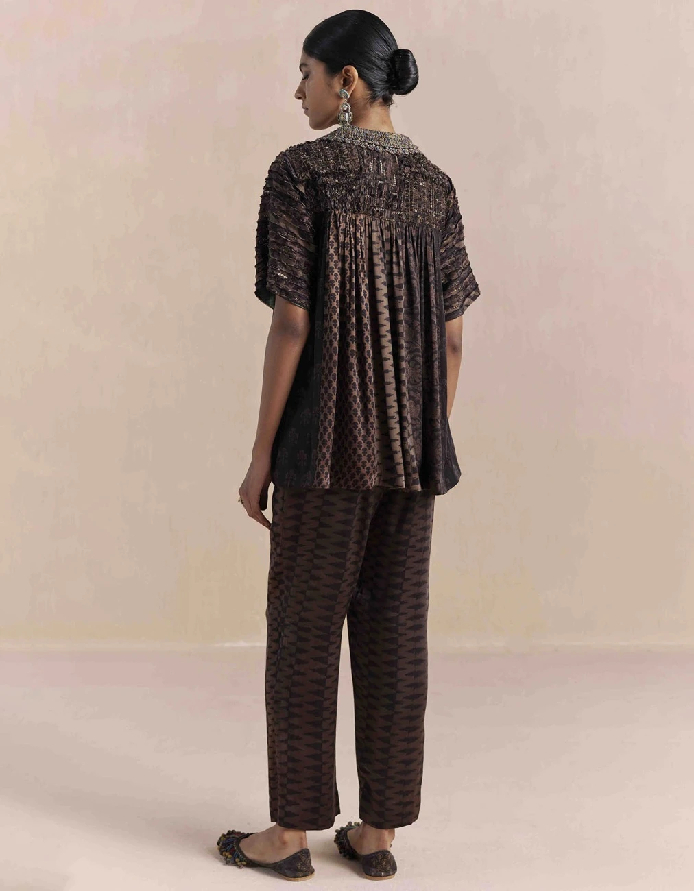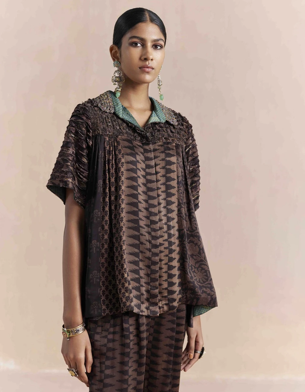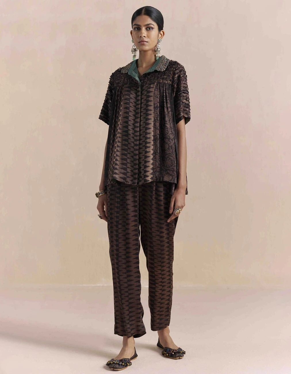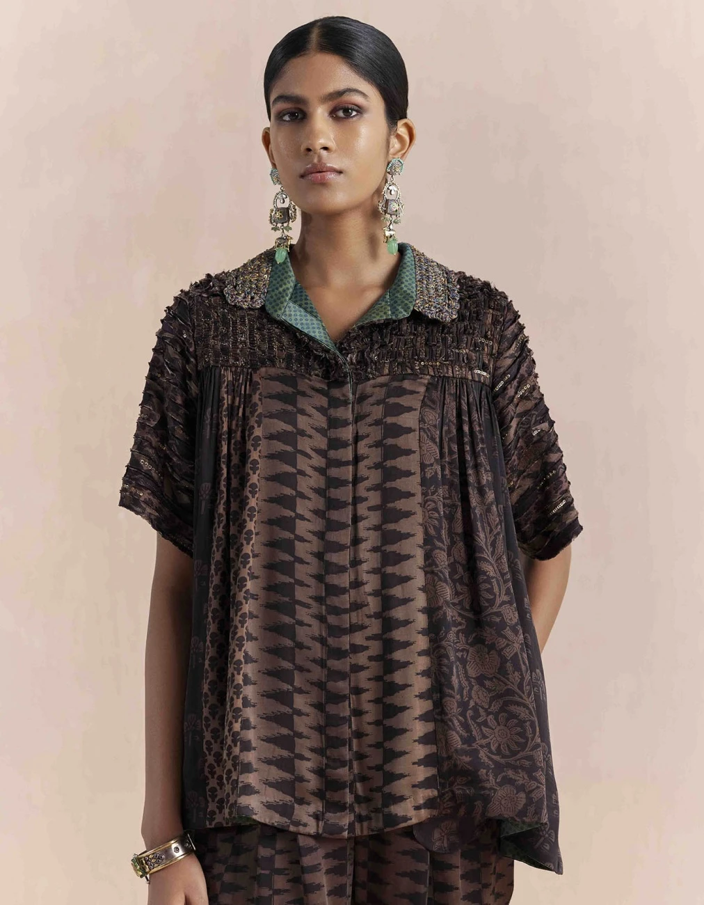 - Elegant shirt crafted from luxurious Bagru hand block printed on Silk textile, offers an effortless and comfortable fit features gathered yoke at the front and back
