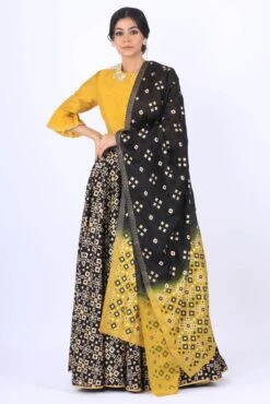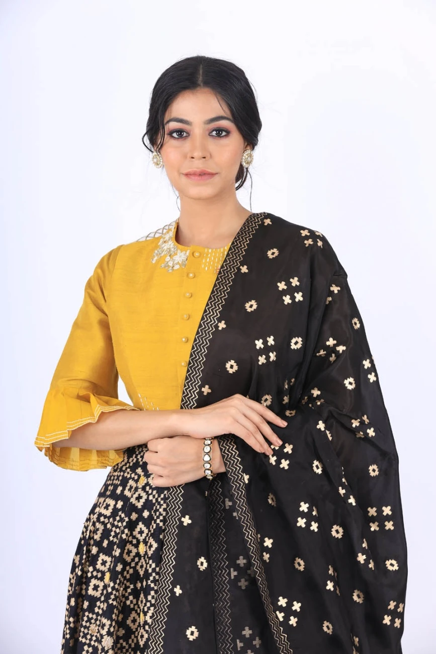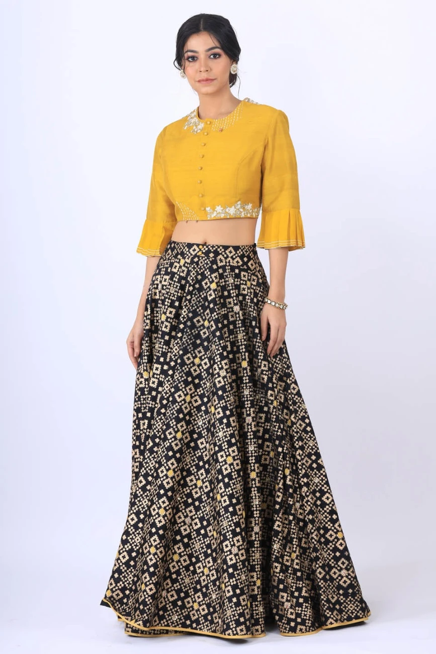- Black ikat printed Lehenga set paired with Mustard crop top (with floral & kantha embroidery) and ikat printed dupatta
