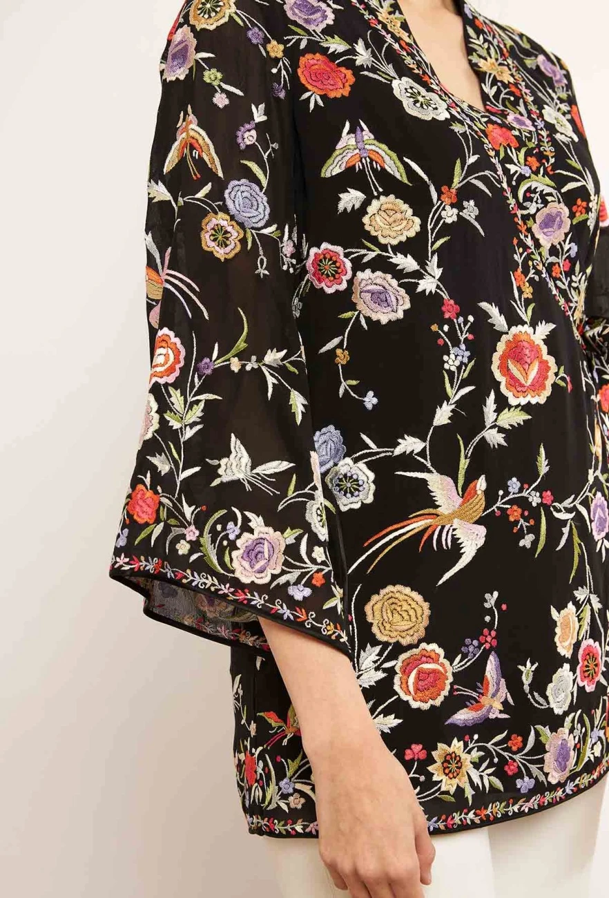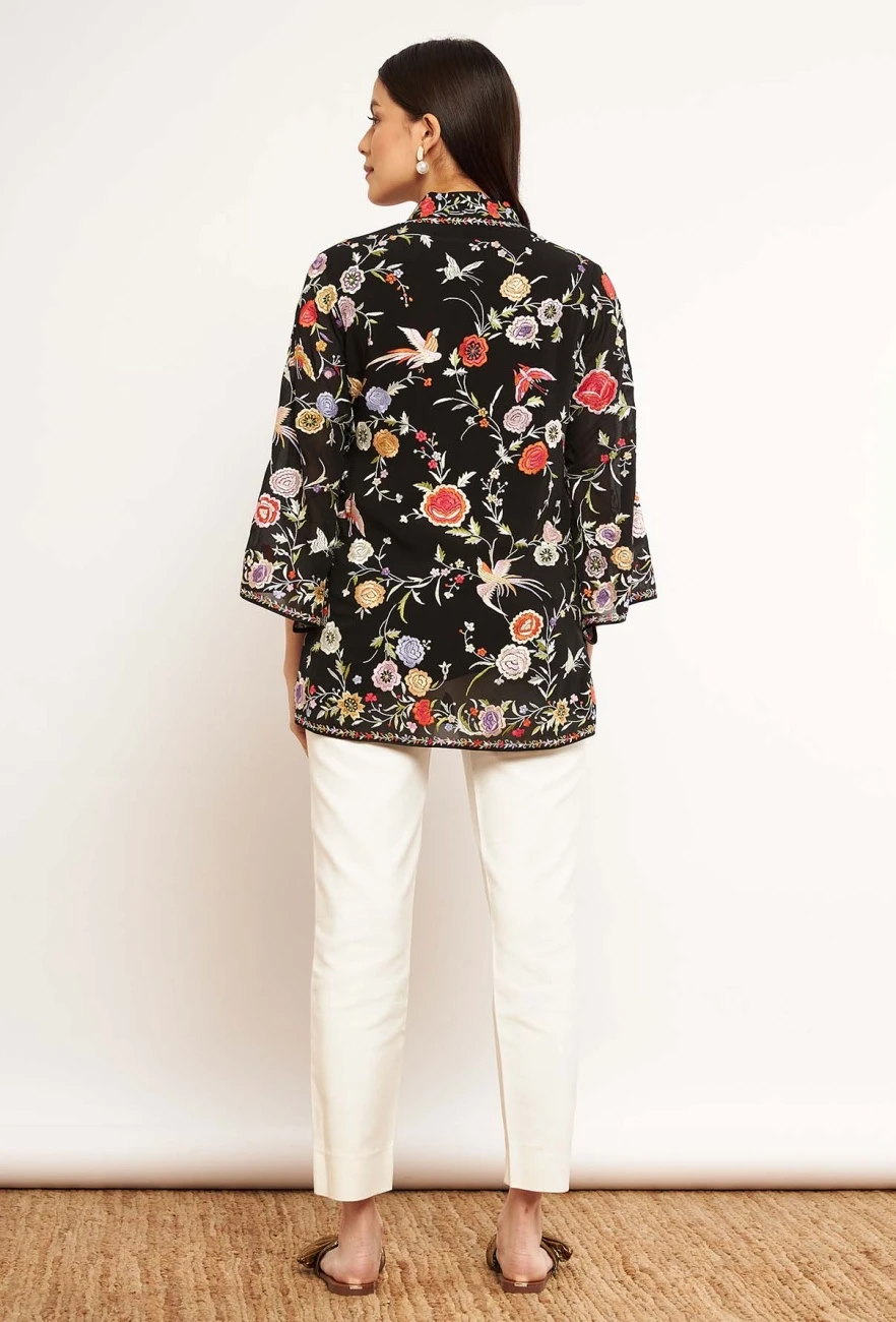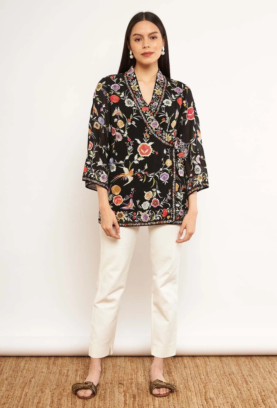 - Featuring black PATINE wrap top with Classic gara hand embroidery with silk threads in pure silk georgette