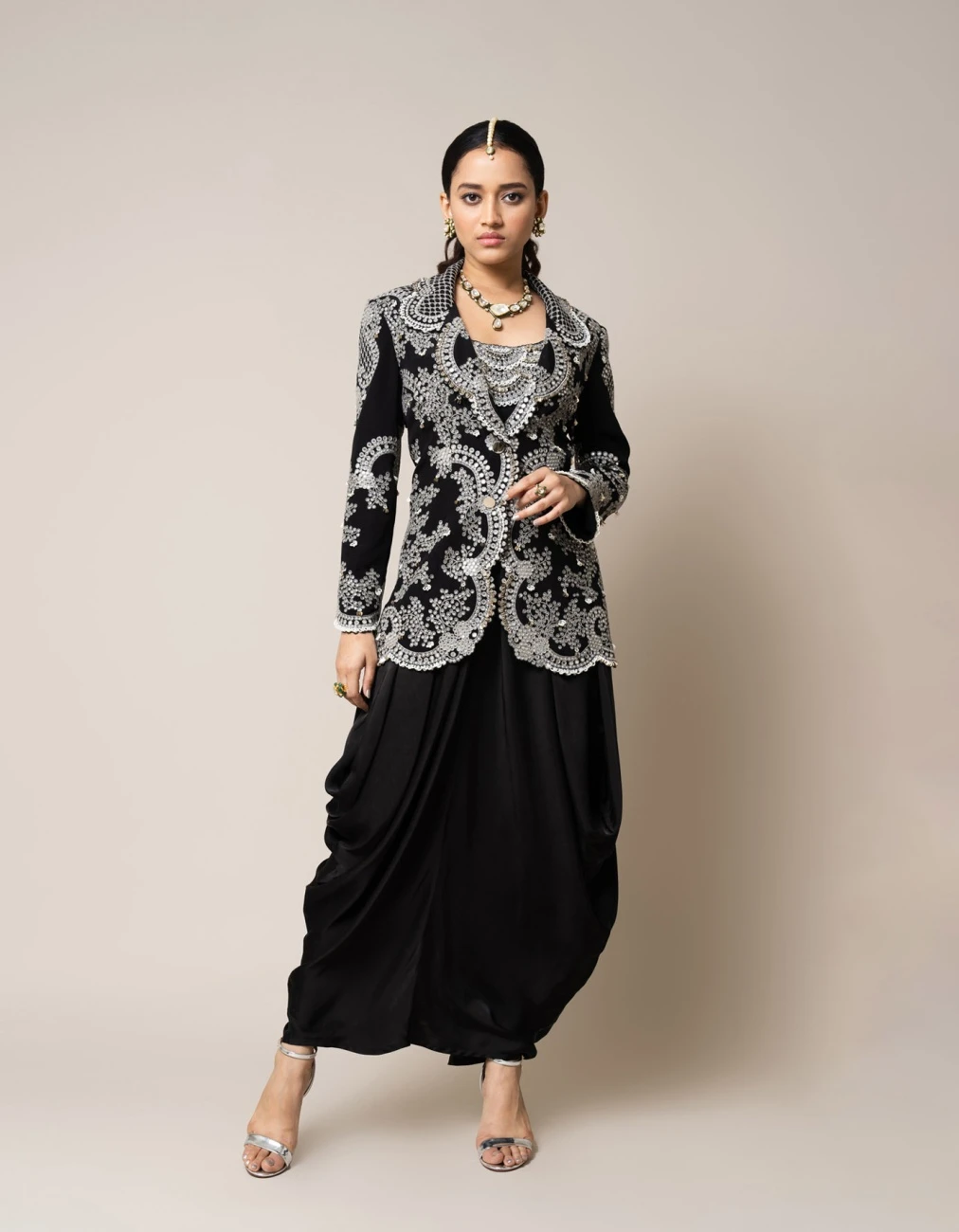 - Black hand embroidered blazer with Black satin sack dress