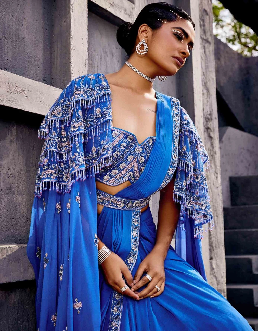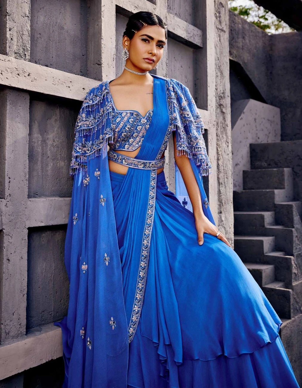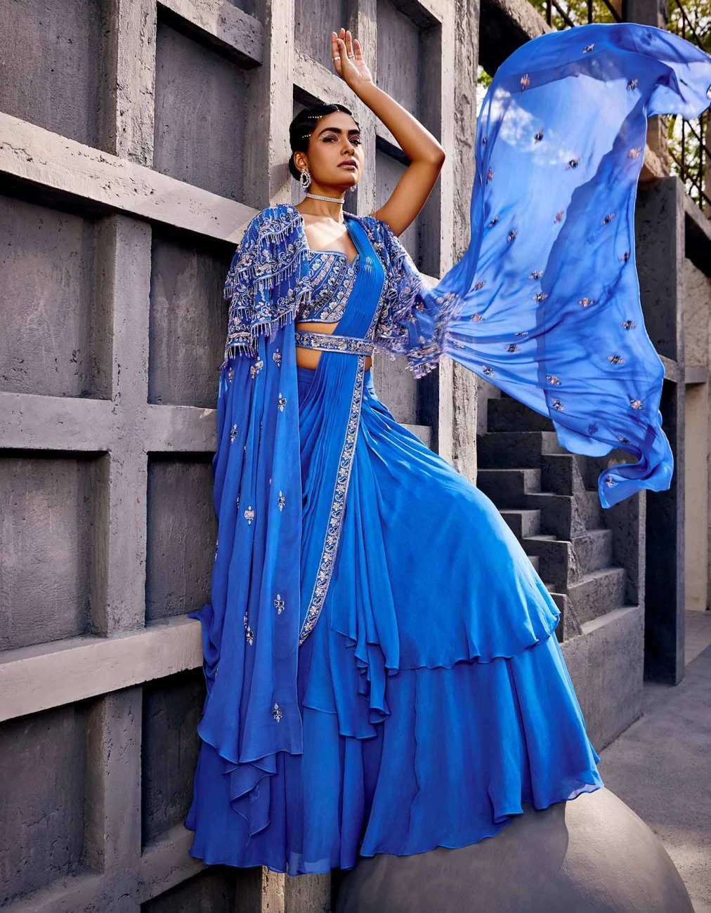 - A pre-draped blue lehenga saree accompanied with a floor length cape