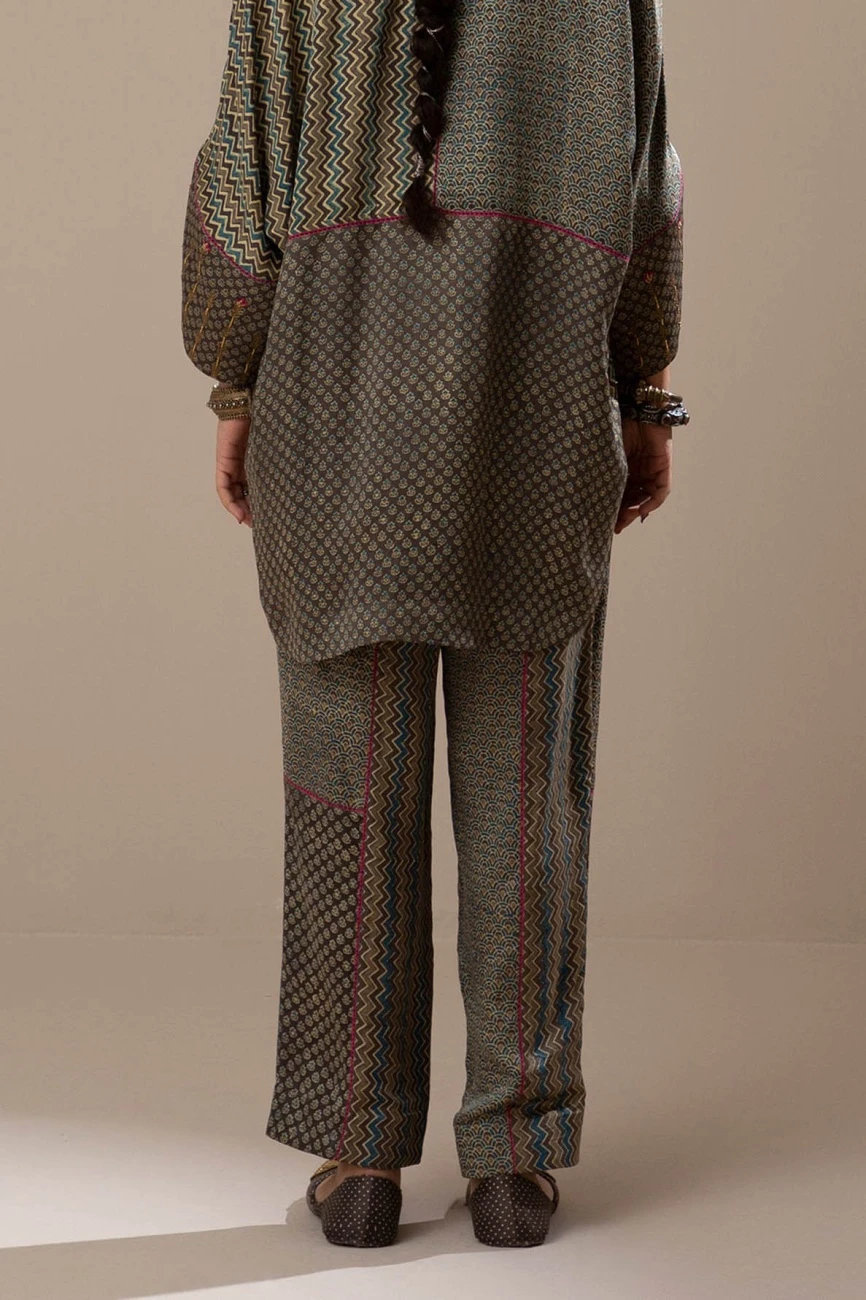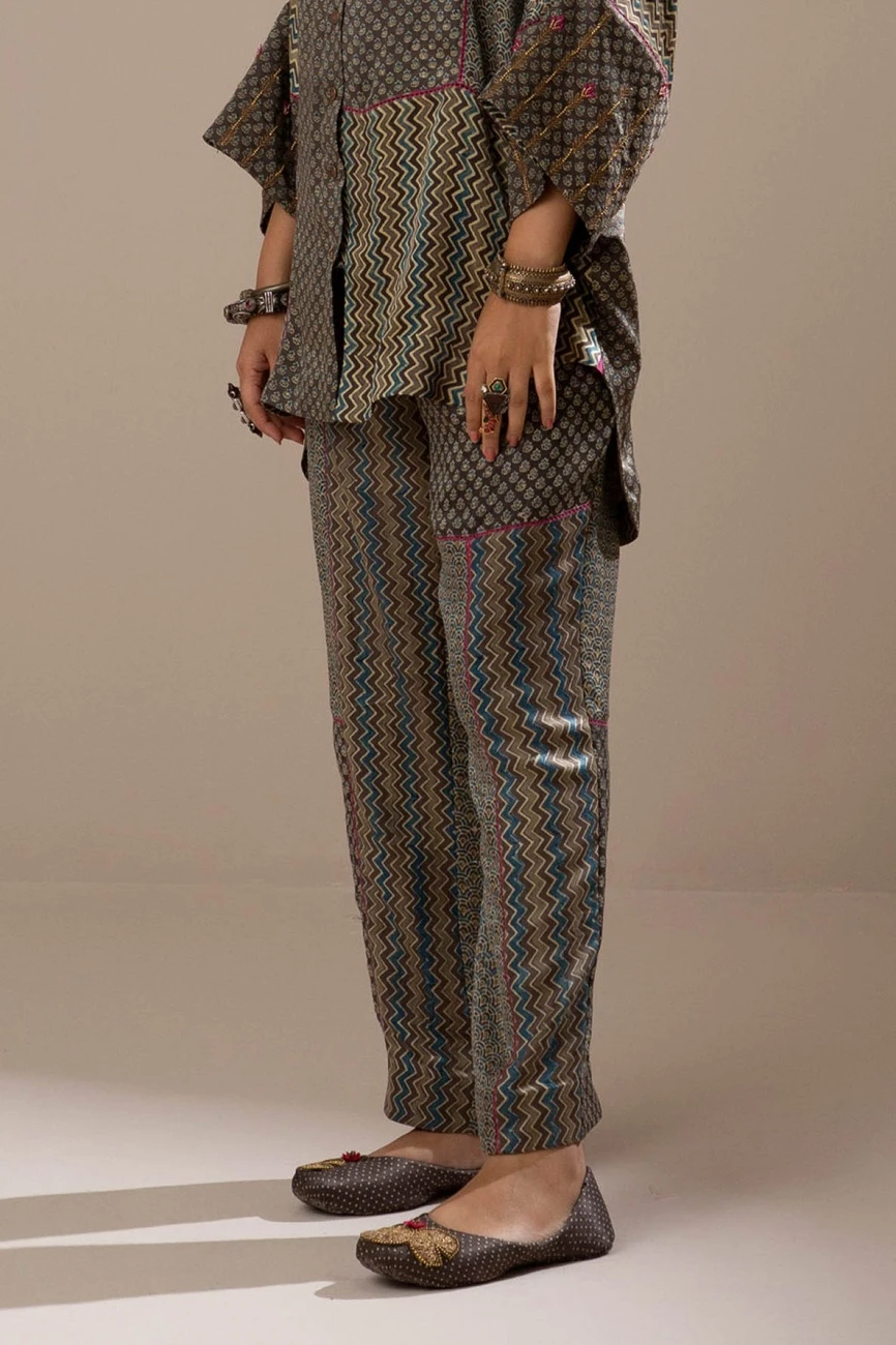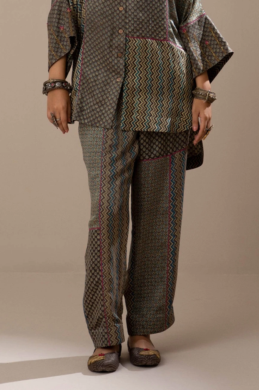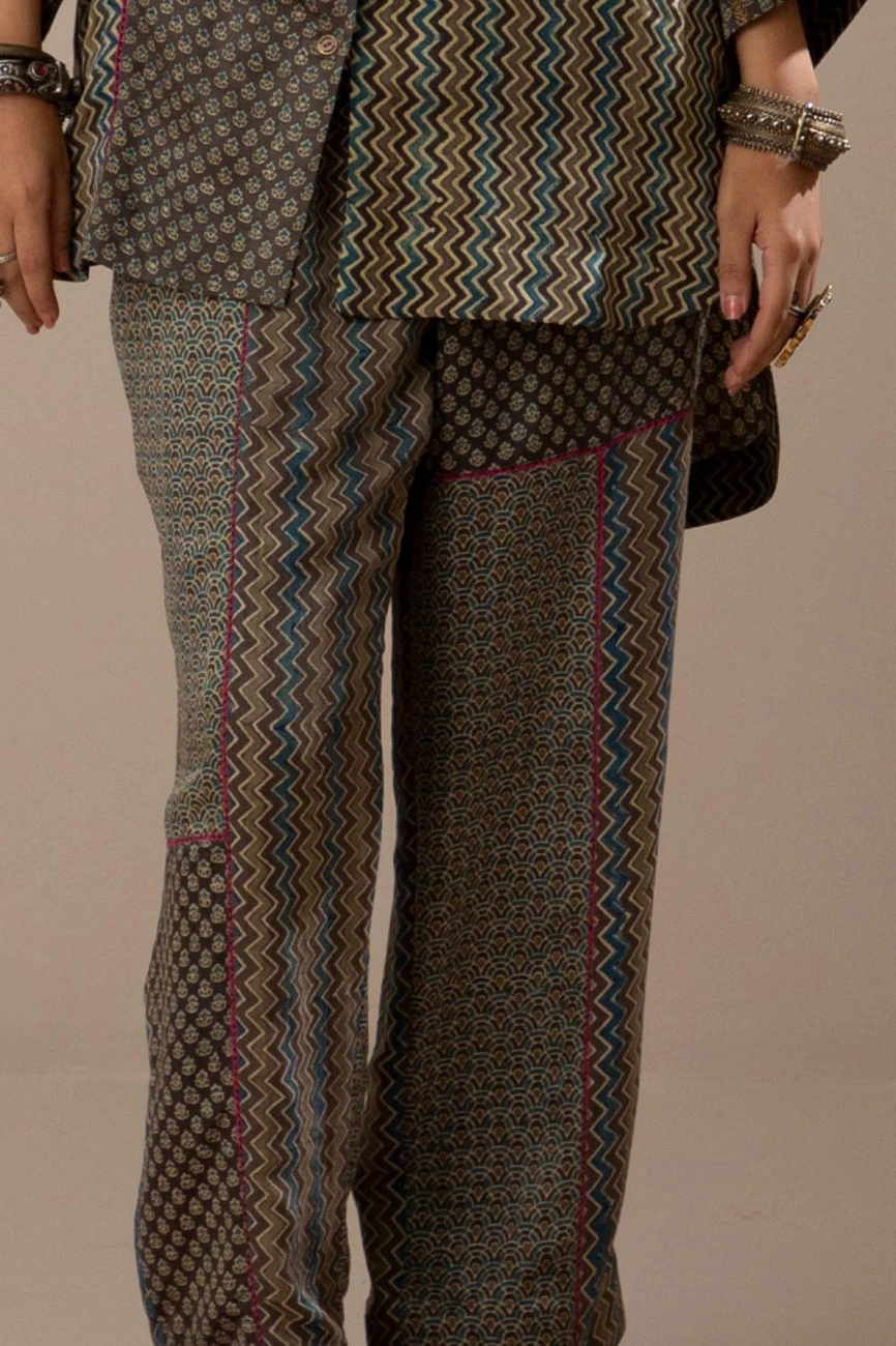 - Comfortable pants crafted by blocking different ajrak hand-block printed Gaji silk with front died pockets