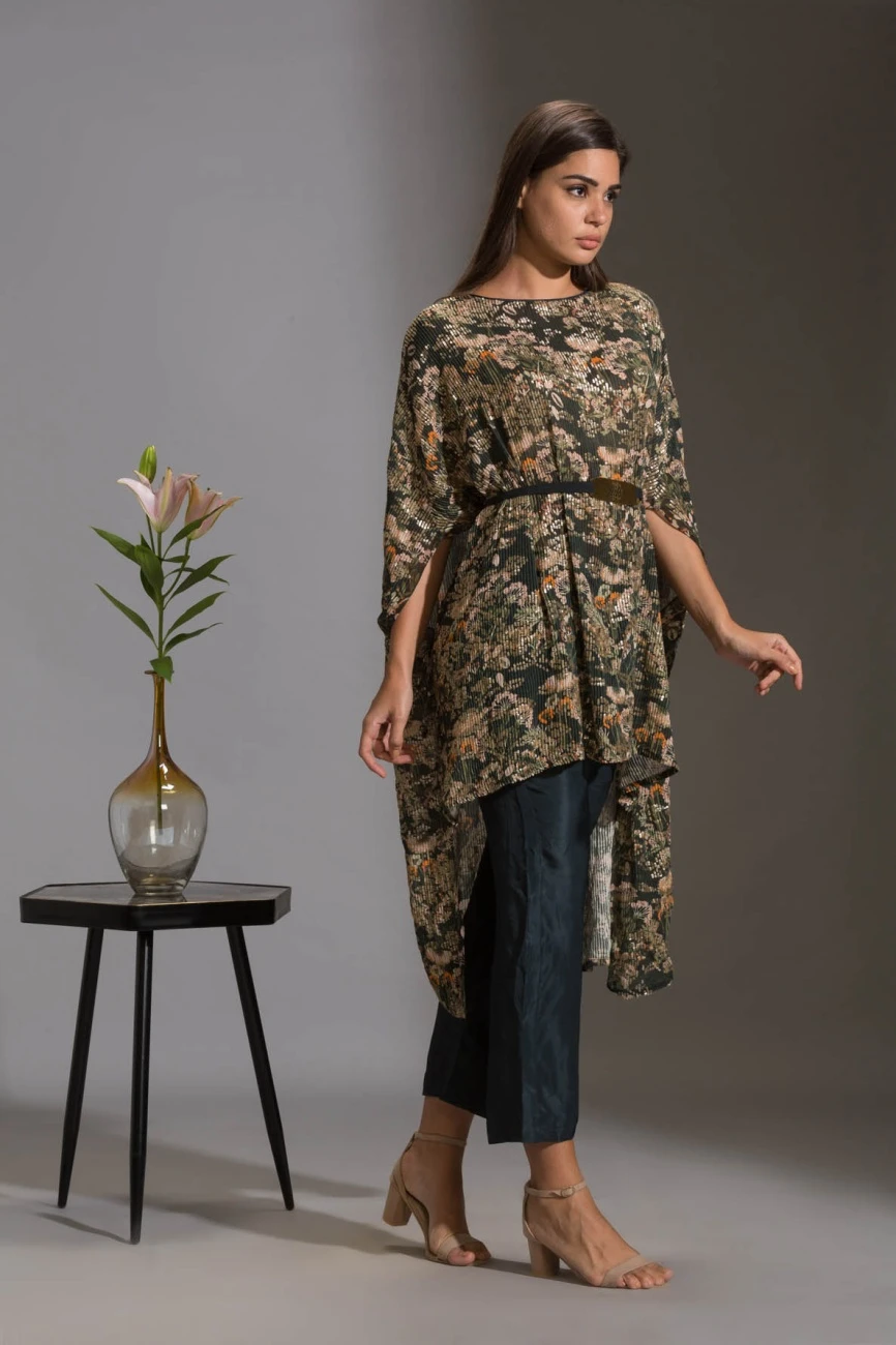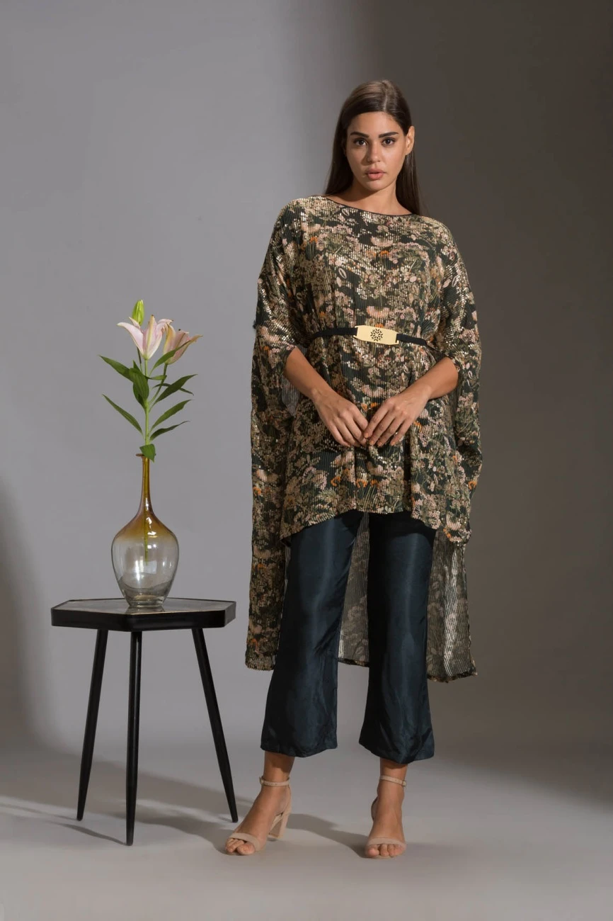 - Kaftaan printed sequence top with belt paired with bottle green pants