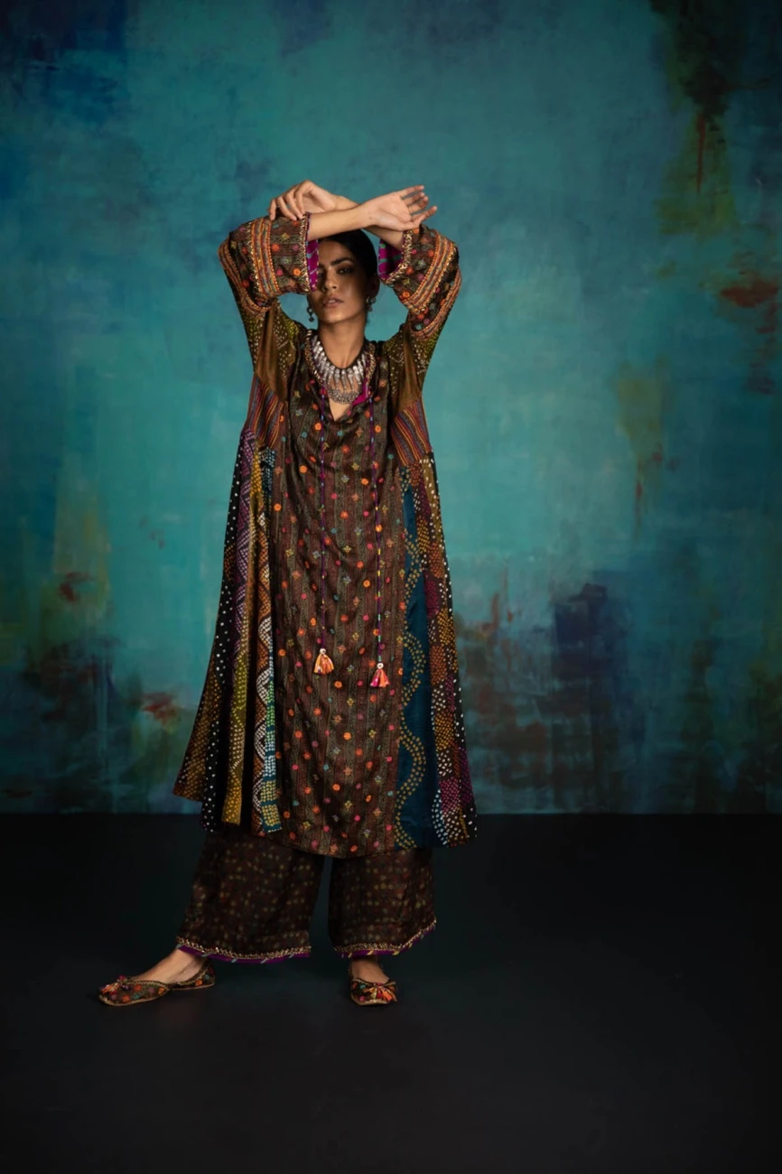 - Featuring geometric hand-embroidered borders of dabka metals and resham threadwork