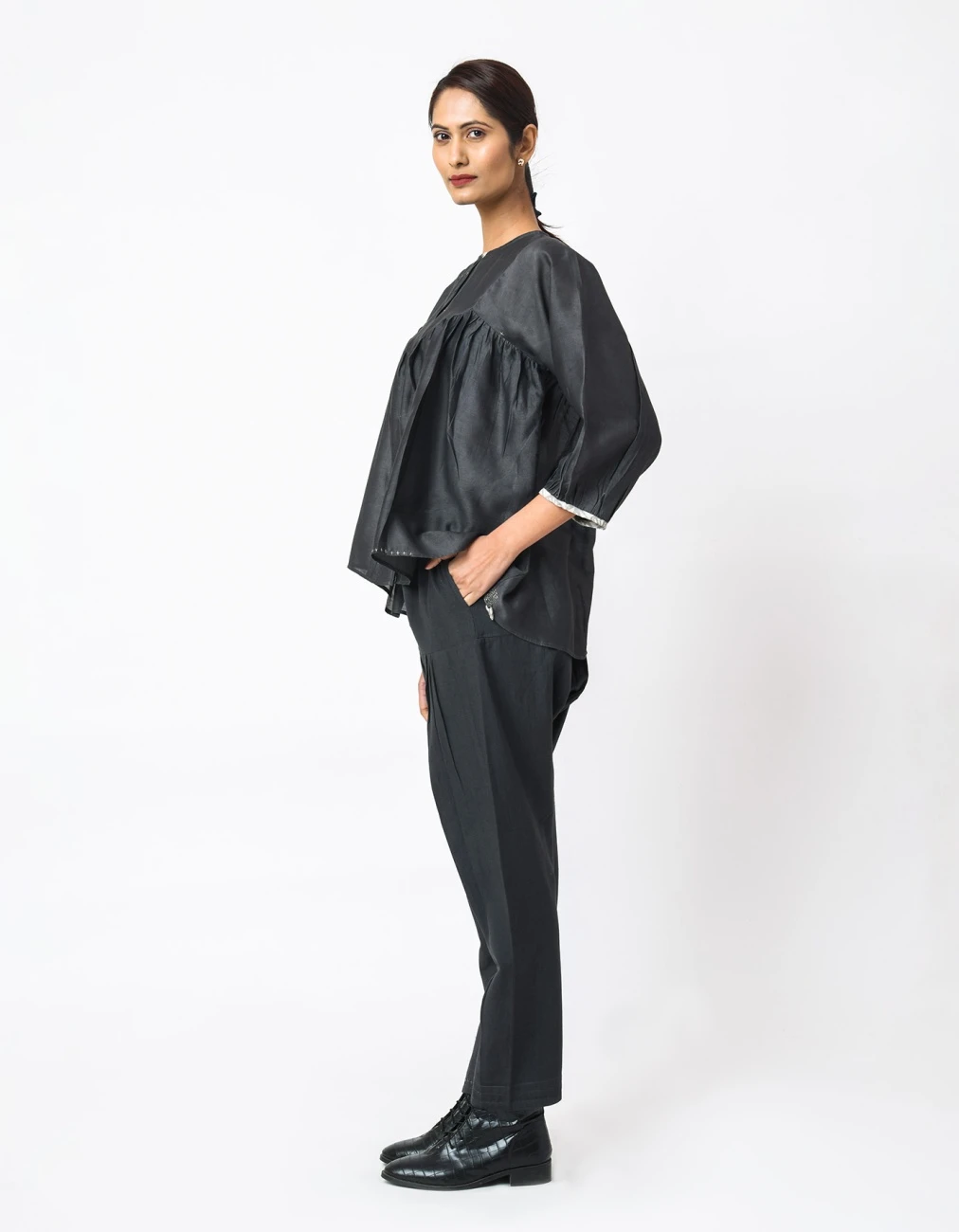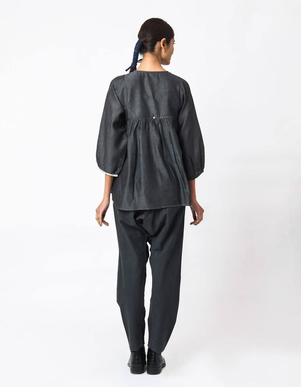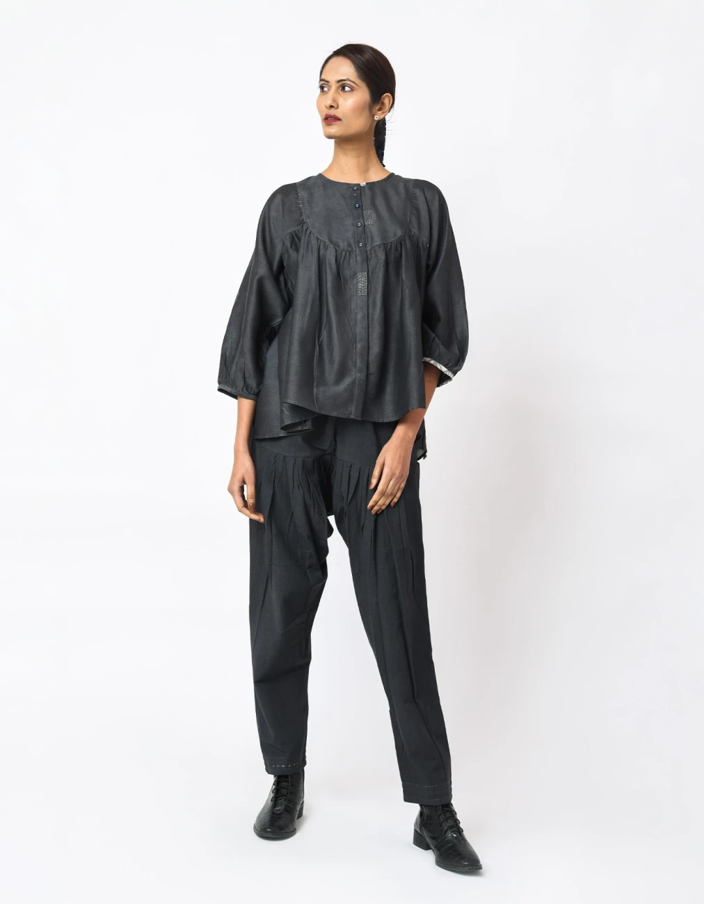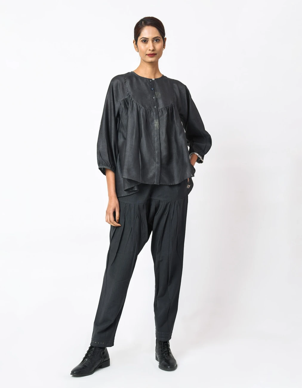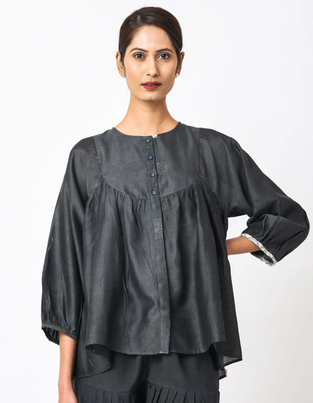 - Featuring natural dyed chanderi button down top, detailed with handwork in golden thread and handmade buttons