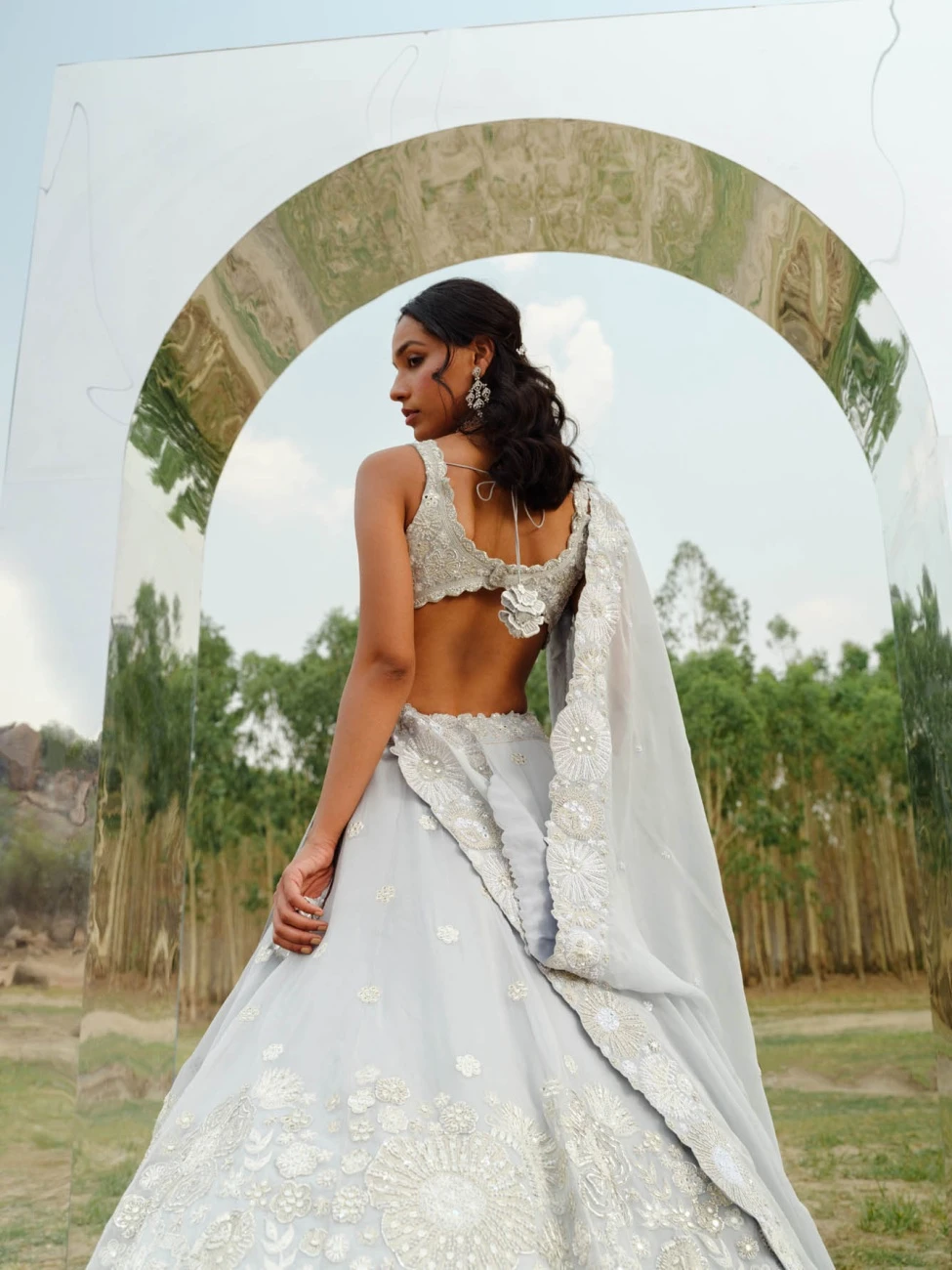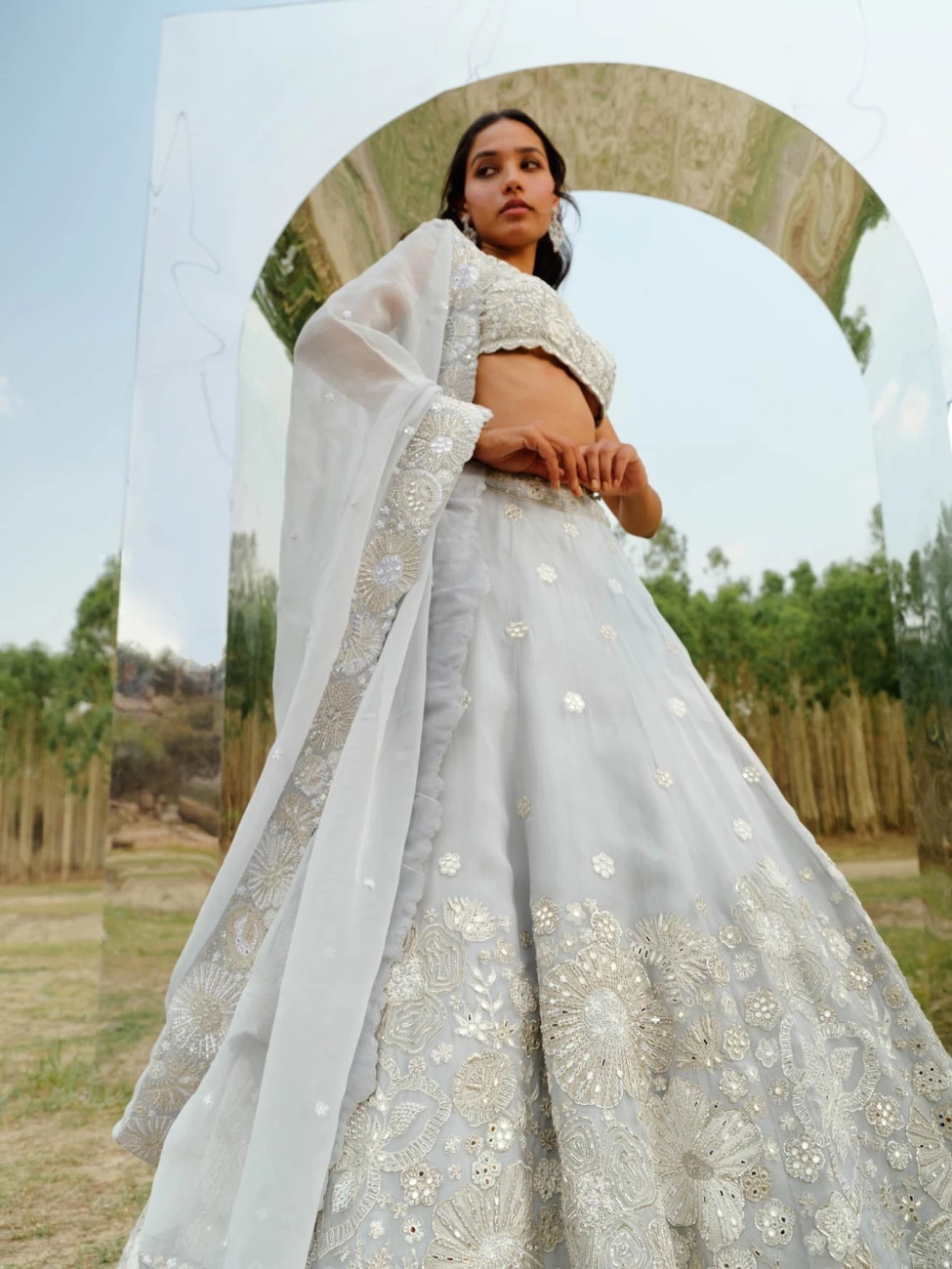 - Cloudy blue silver embroidered lehenga paired with encrusted blouse and dupatta