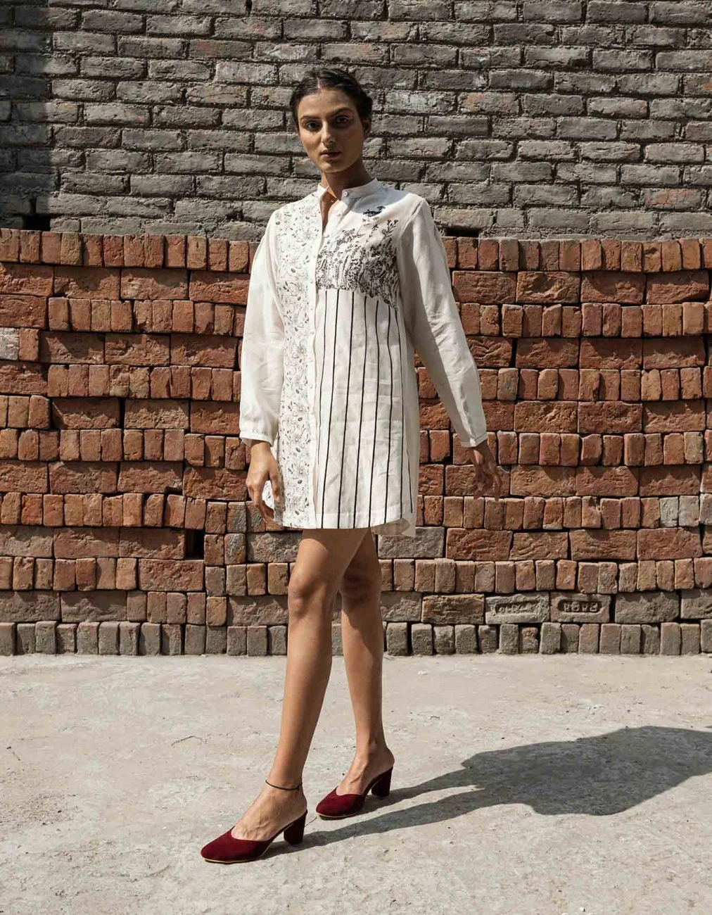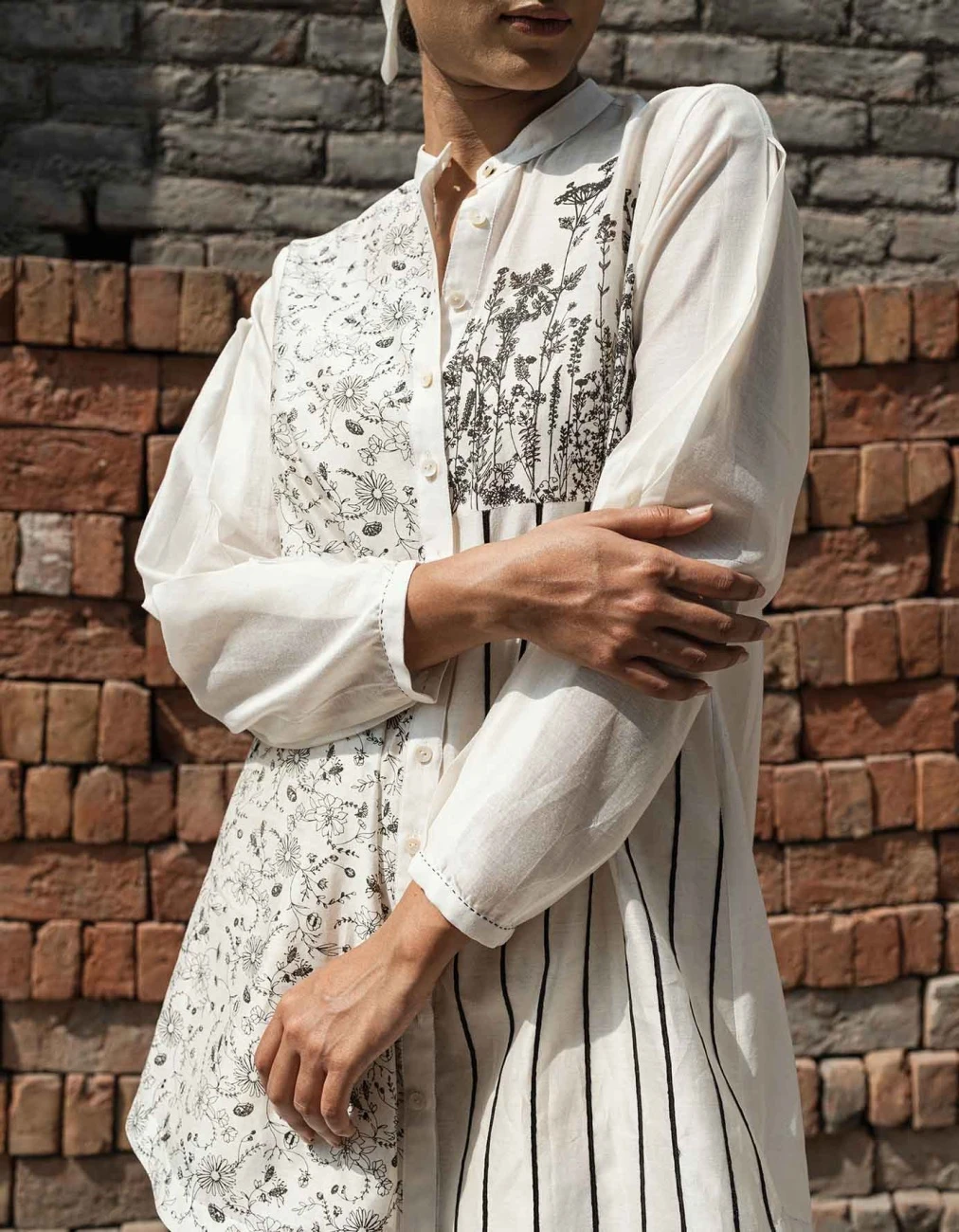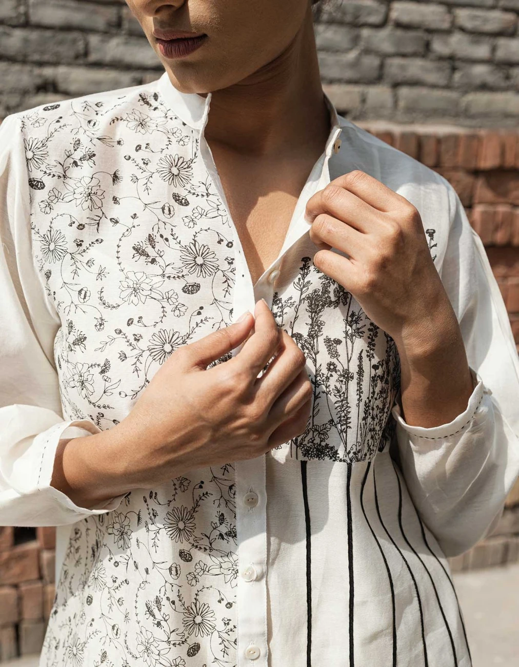 - The classic mandarin collar shirt with panels of floral print and tape detailed Chanderi, is the perfect example of a contemporary take on the classic long shirt. The amalgamation of different textures takes away from the monotony and typecast of a classic shirt giving it a playful and modern appeal. Timeless and adaptable, this wardrobe essential can elevate any everyday ensemble.