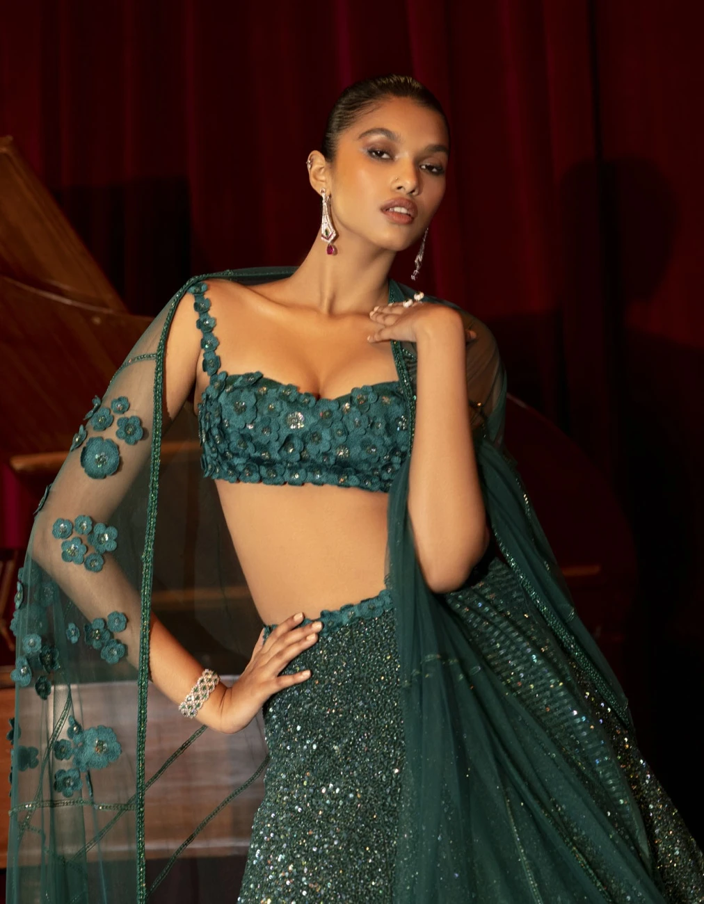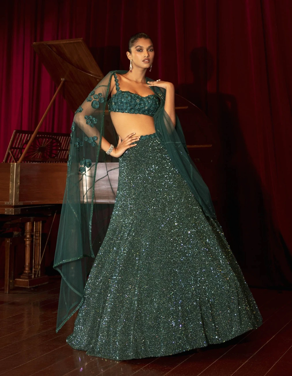 - Forest Green Gitch embelished lehanga with floralcrop top and art deco dupatta