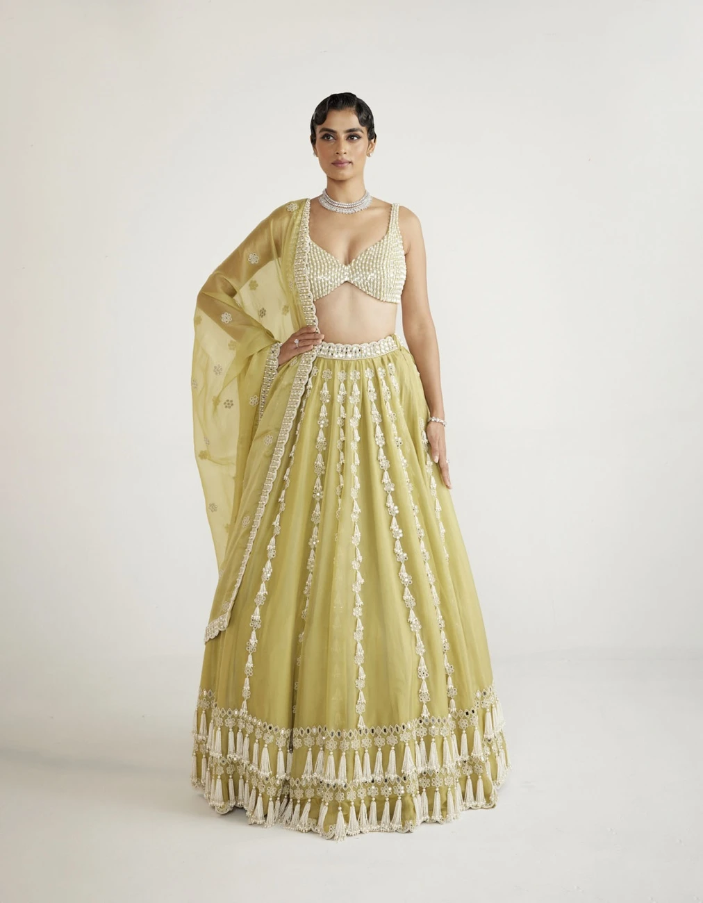 - Fern green chandelier pearl lehenga clubbed with a intricately hand embroidered blouse and dupatta.