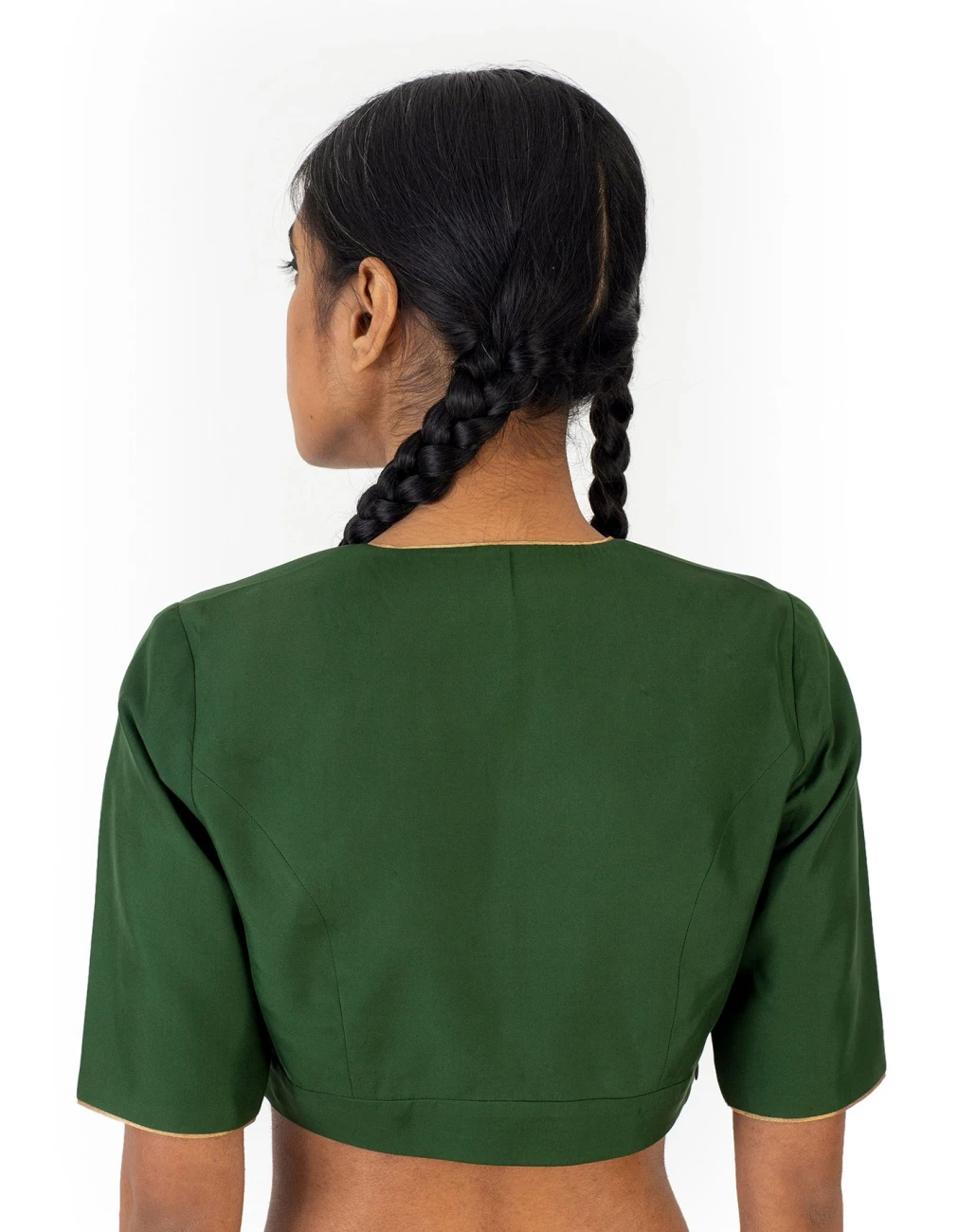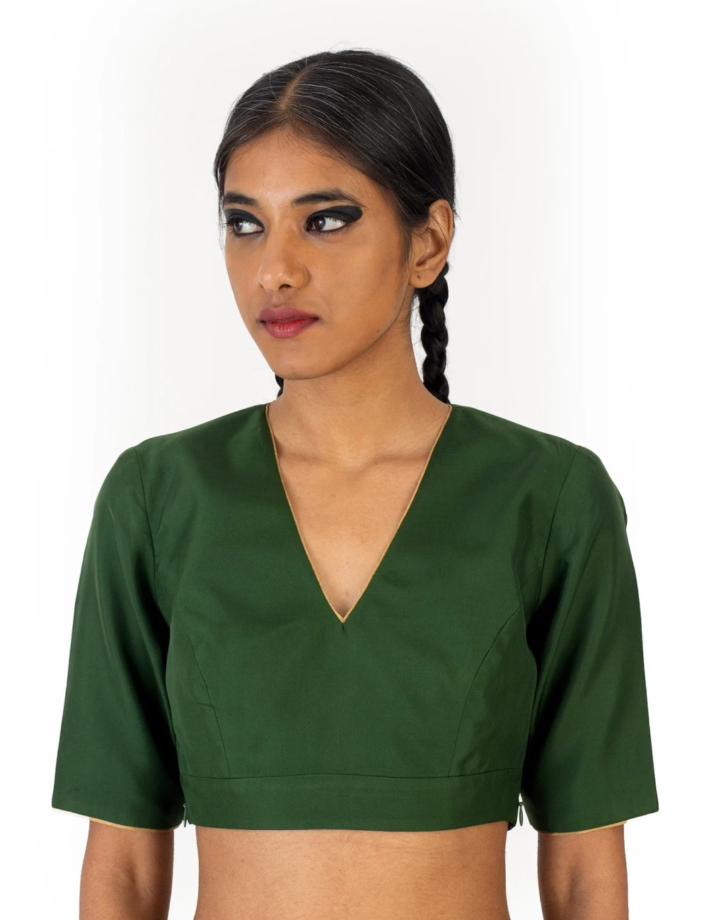 - ‘Ahmadi’ deep moss green silk twill blouse features a V neckline with a gold tissue piping