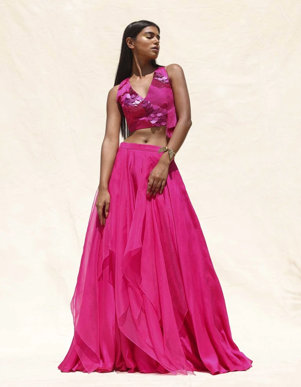 - Hot Pink Evening Drape,Crop Top & Panel Lehenga