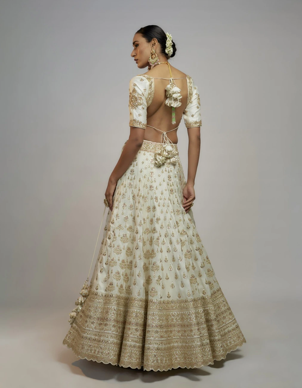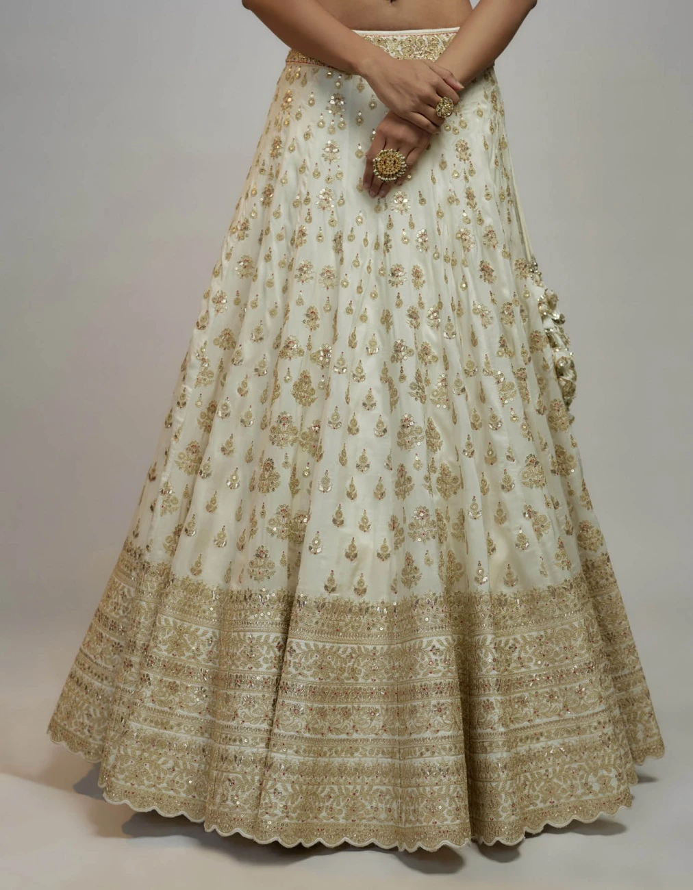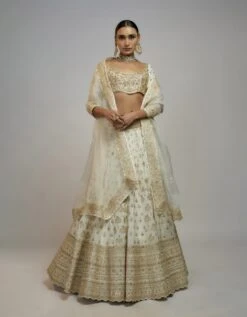 - This stunning lehenga, embellished with exquisite gold detailed zardosi work, reflects the geometry and design of Indian traditional style inspired by the rich history it entails