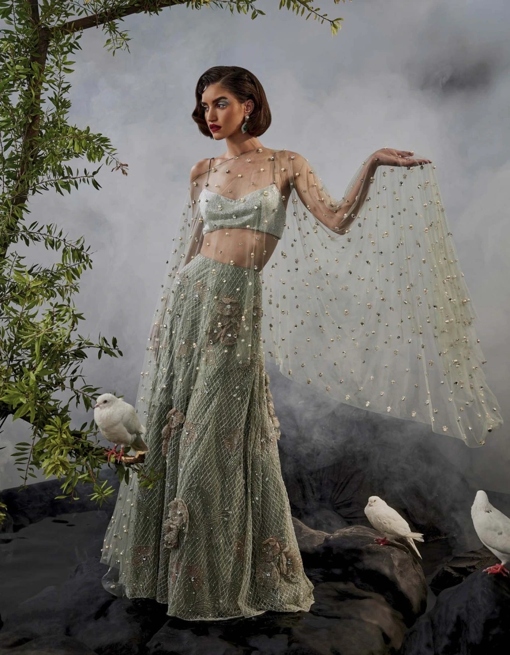- Grey-Green Grid Work Lehenga with Beaded Blouse and Stone Embellished Cape