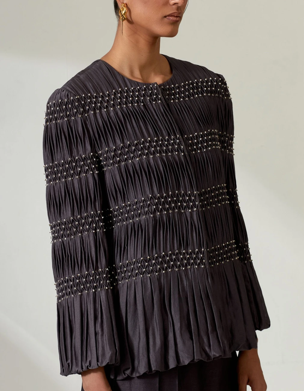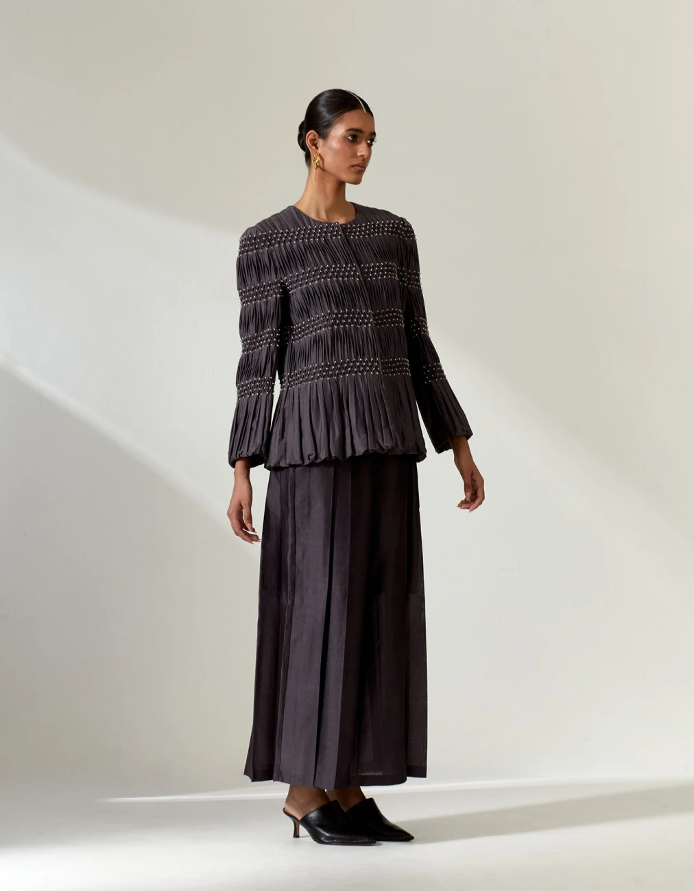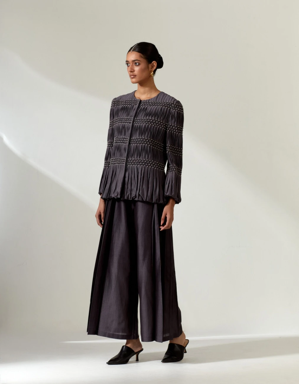 - Featuring the hand-smocked jacket wit hakama pants in grey