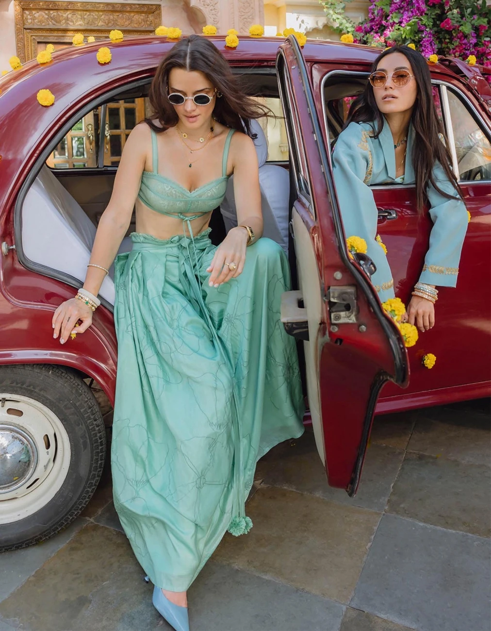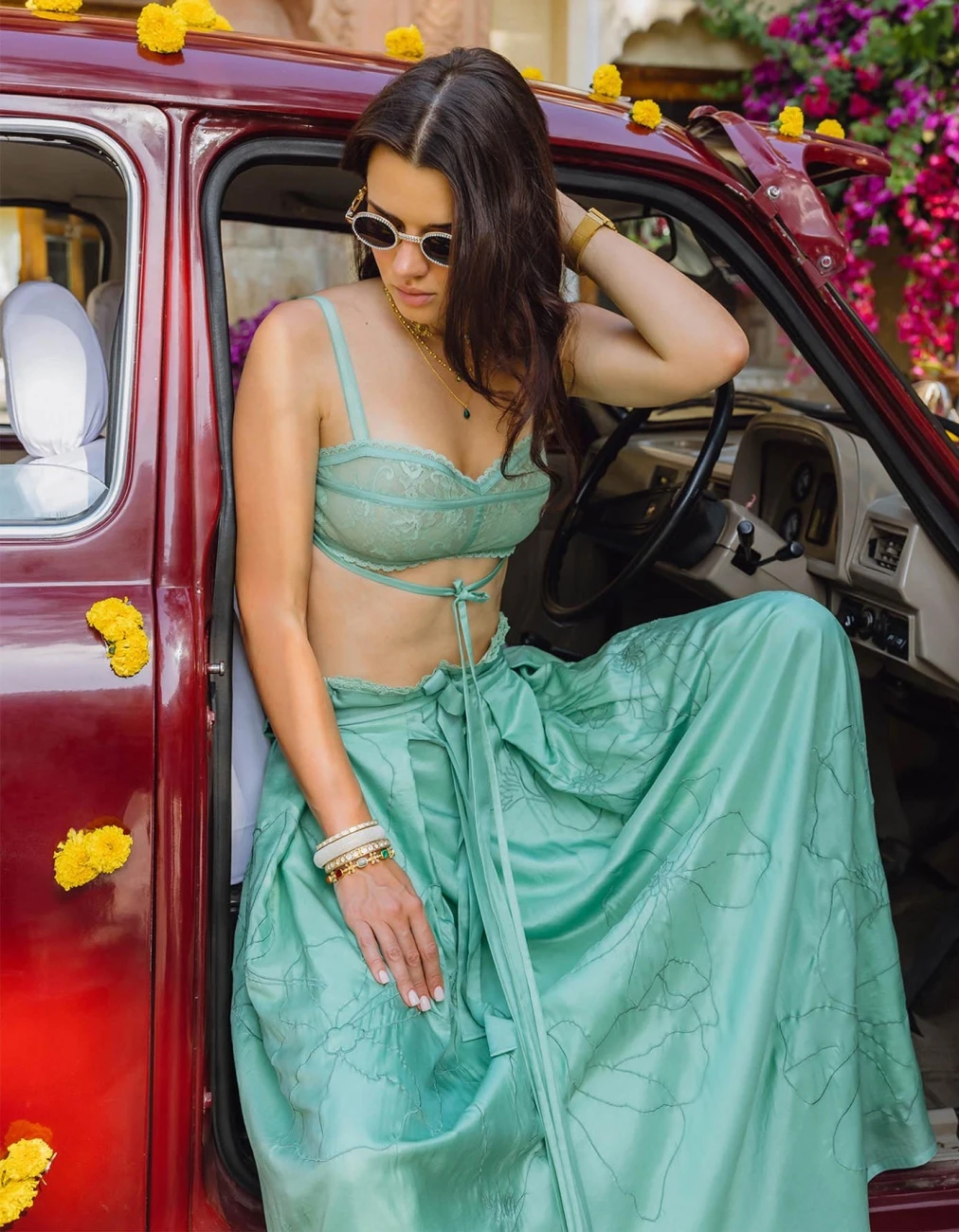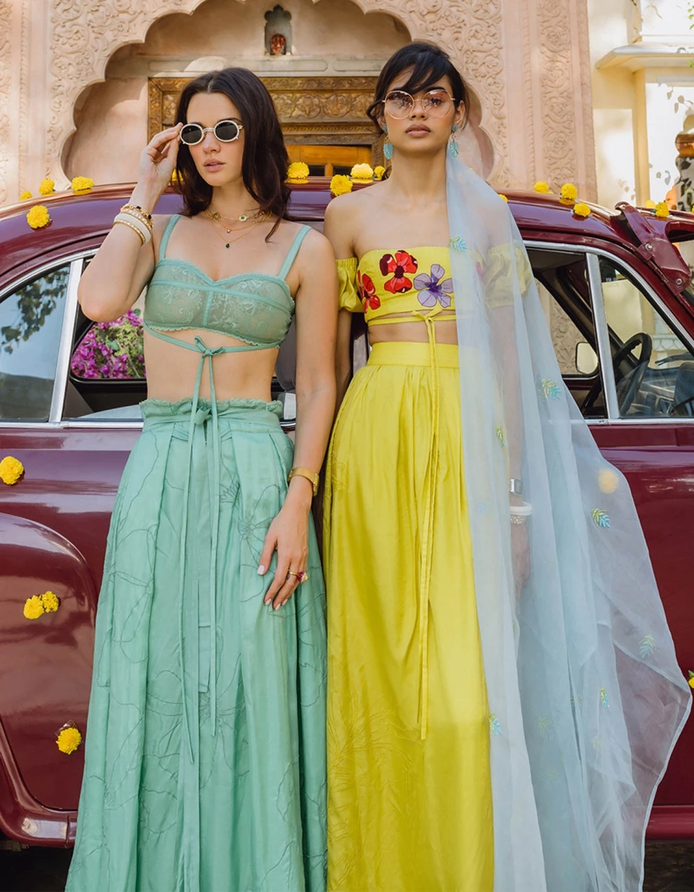 - High waised, and pleated ankle length silk skirt, embroidered with big threadwork flowers, a lace trim on the waistband and silk ties and tulle dupatta embroidered with beaded white daisy motifs