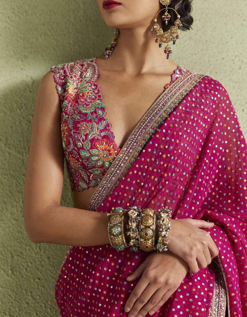 - Hot pink sleeveless blouse with plunge neckline and colorful floral resham and zardozi hand embroidery