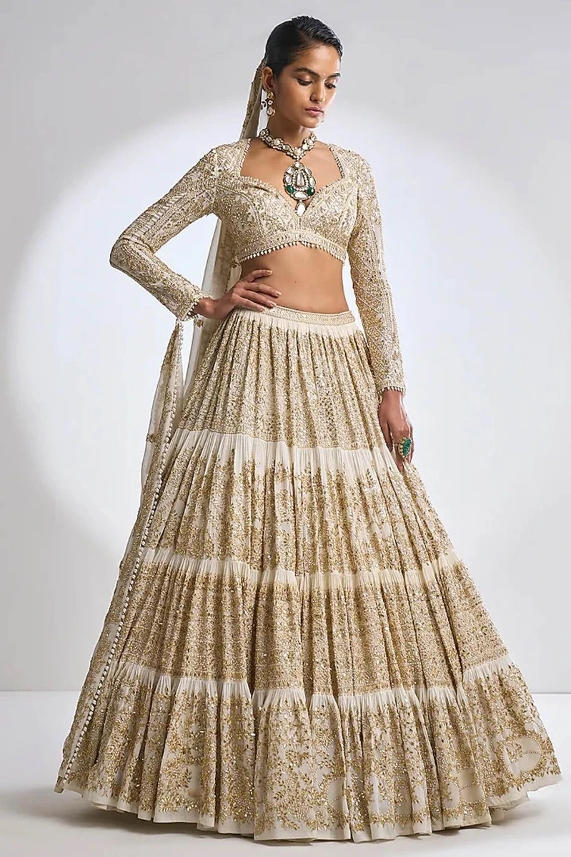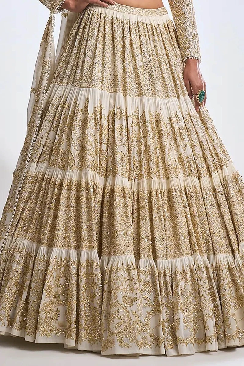 - This ivory lehenga set features a three-tiered skirt with exaggerated flair and traditional all over gota patti embroidery