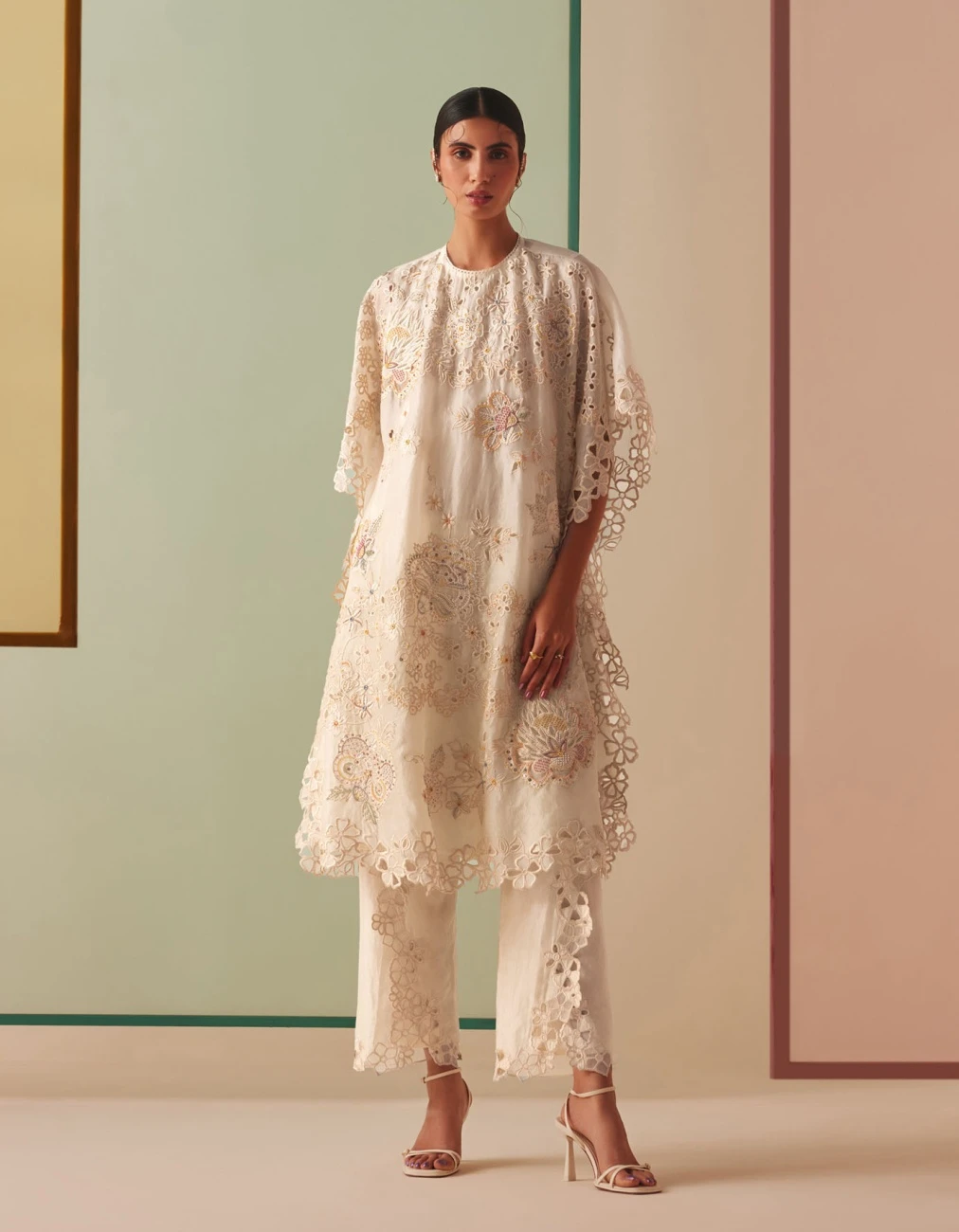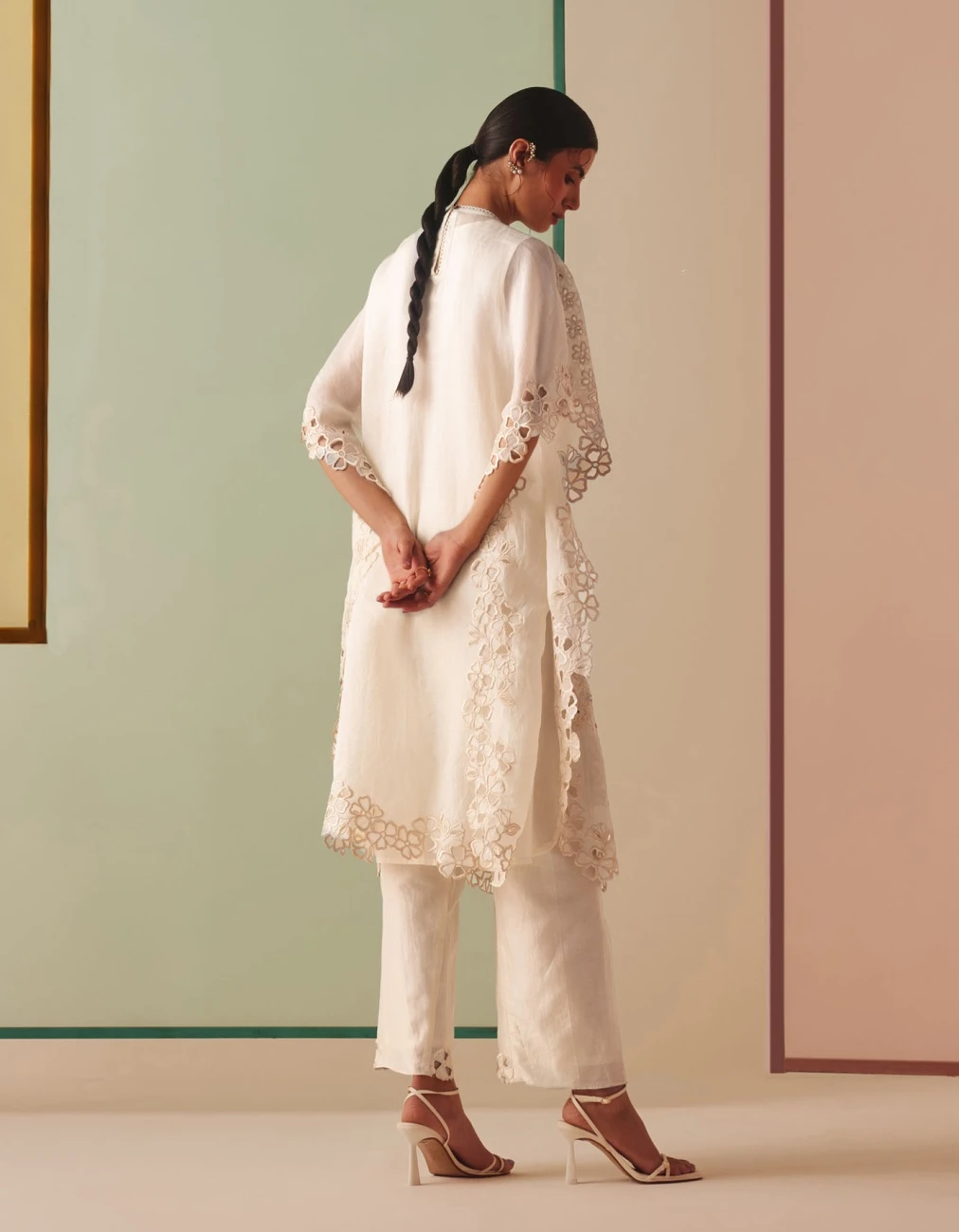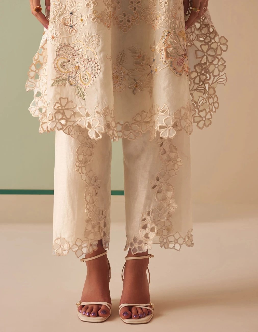- Ivory Chanderi Sheer Applique And Cutwork Pants Tulip Pants