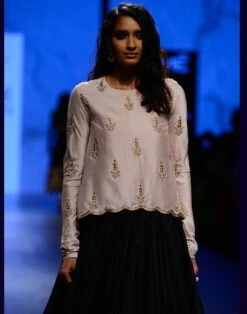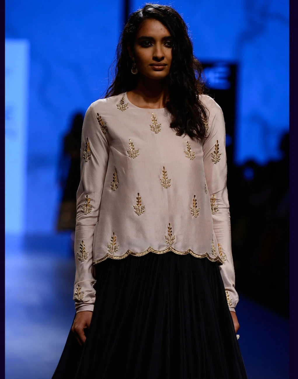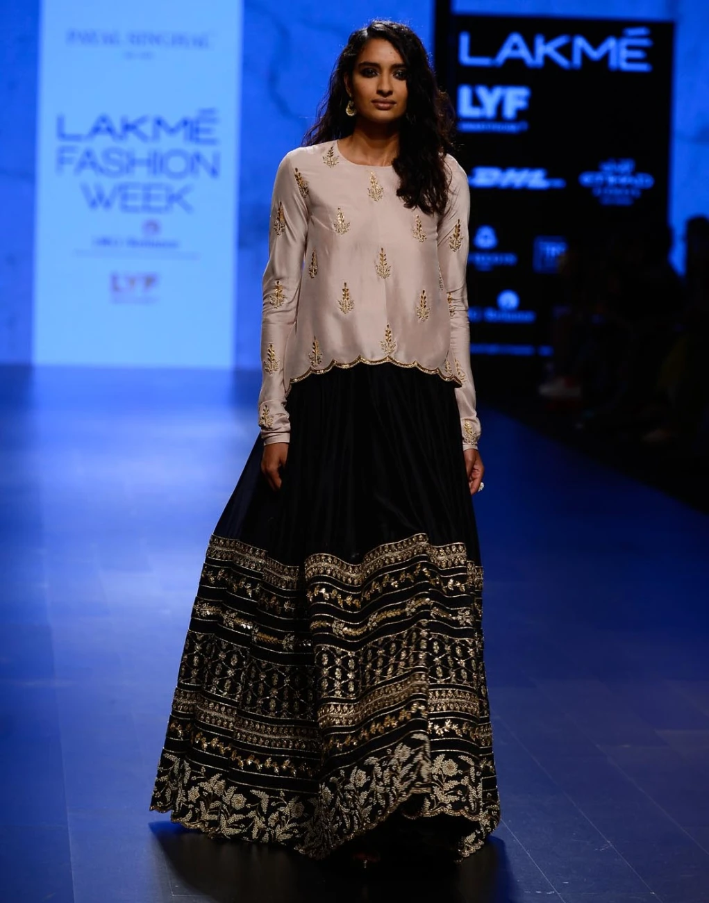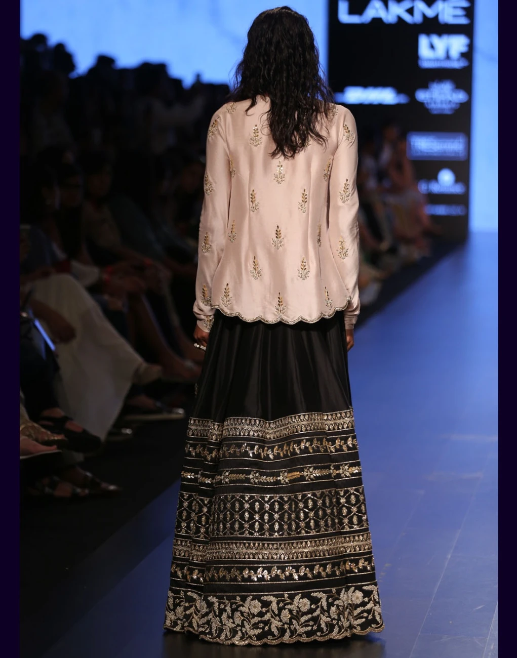 Payal Singhal combines clean and minimalist cuts with exquisite pearl and mukaish embroidery. The silhouettes seamlessly merge the traditional and the modern by pairing off-shoulder cholis with lehengas, and featuring cold shoulder kurtas and scalloped hemlines.