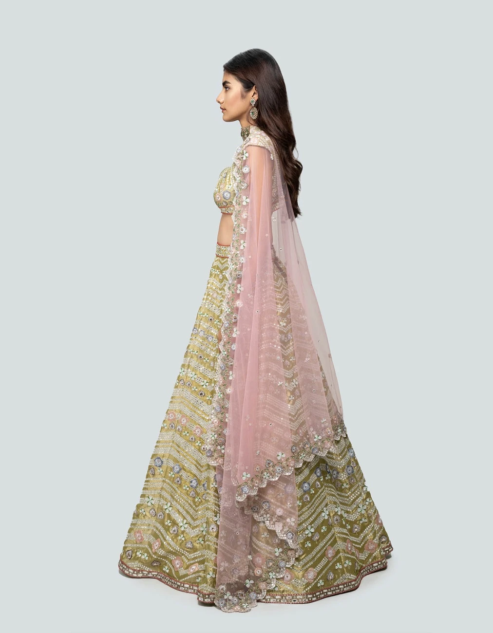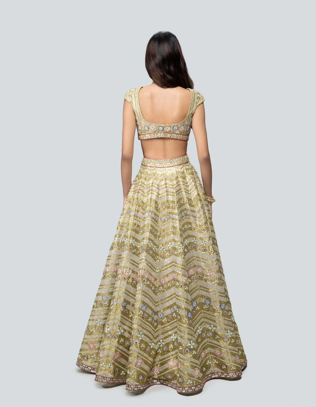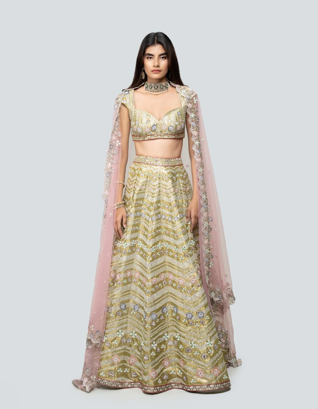 - Lime Green embellished heavy kali tissue plastic mirror work lehenga with sleeveless blouse & cutwork border dupatta