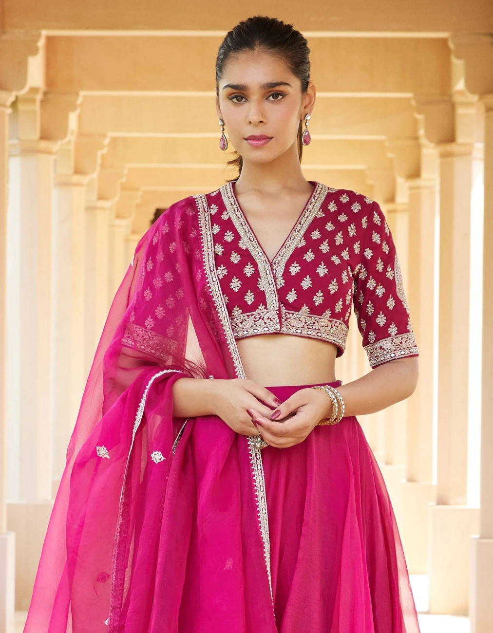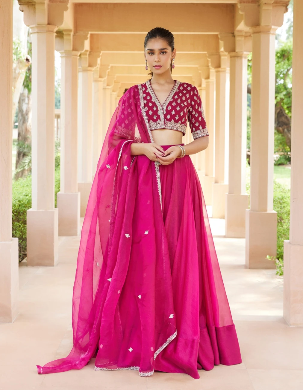 - Lehenga skirt paired with hand embroidered blouse and dupatta
