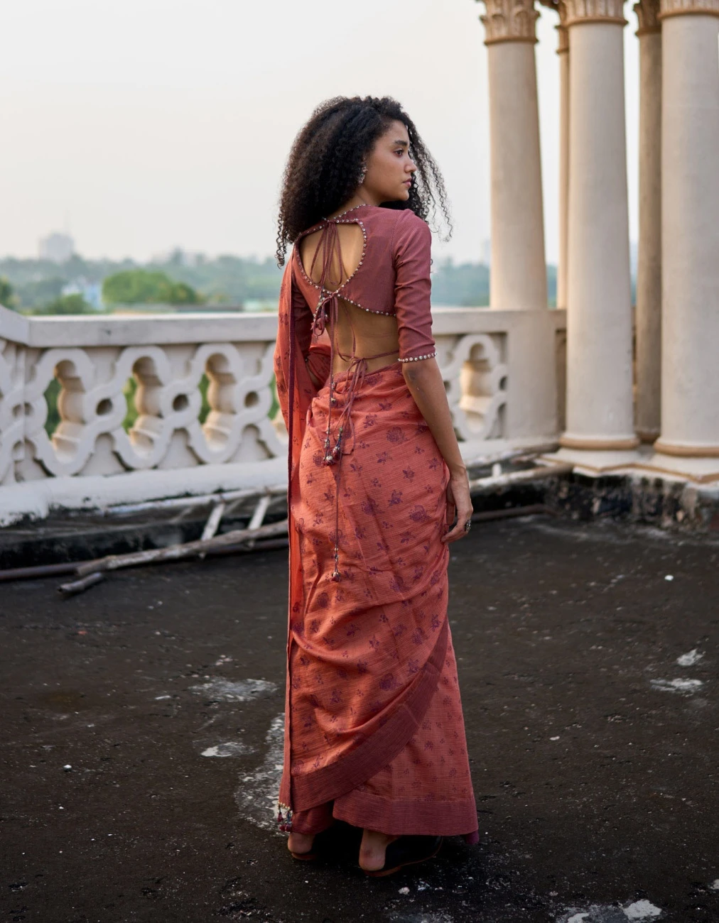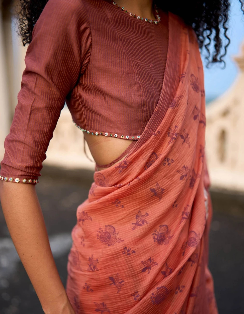 - Handwoven chanderi blouse with handblock printing , hand embroidered embellishments and tassels