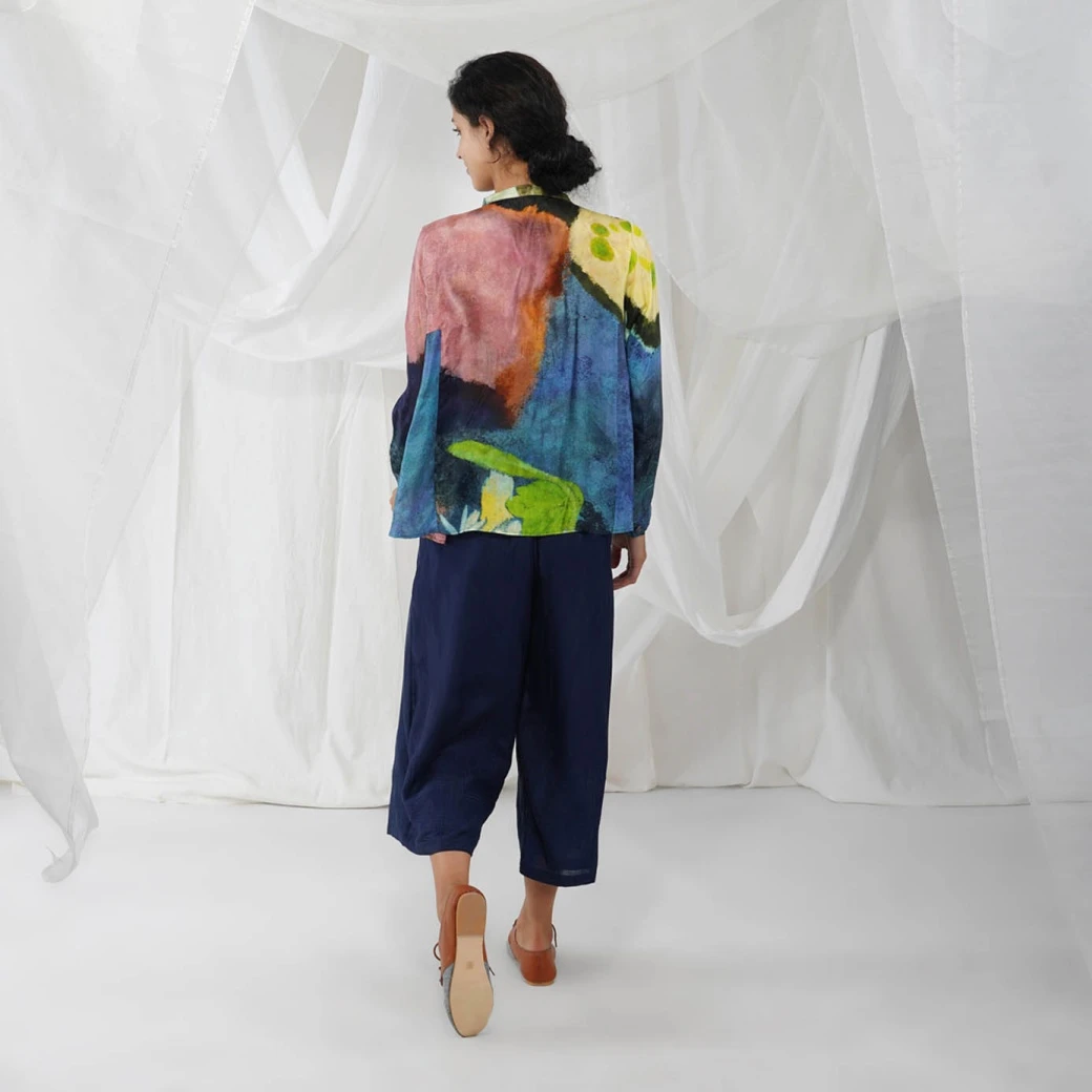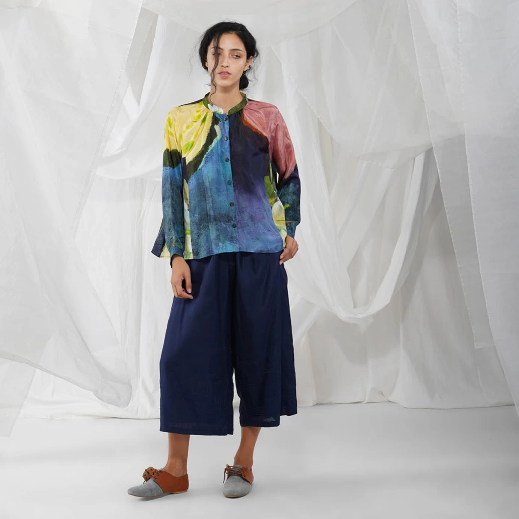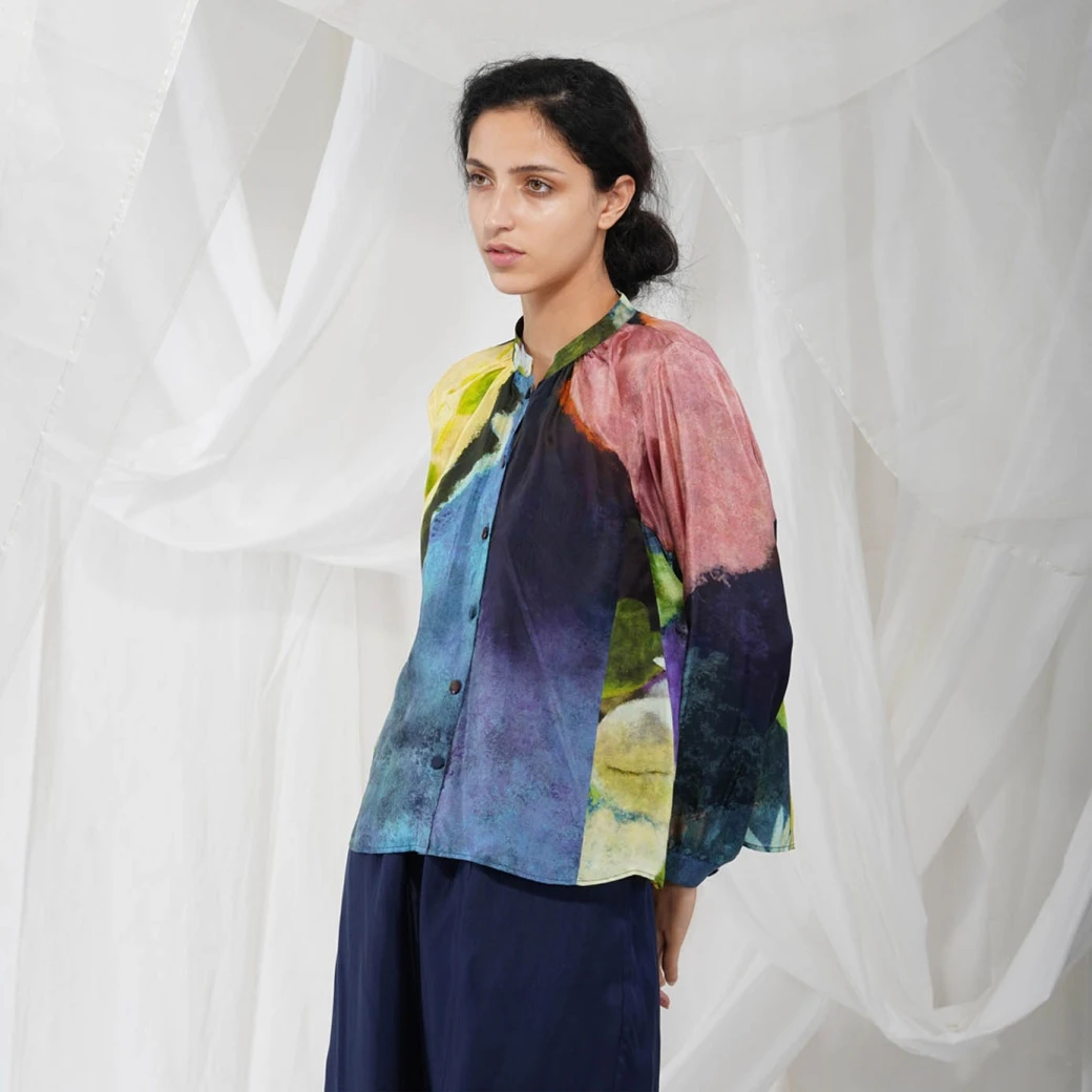 - Food art inspired impressionist printed button-down shirt with chinese collars