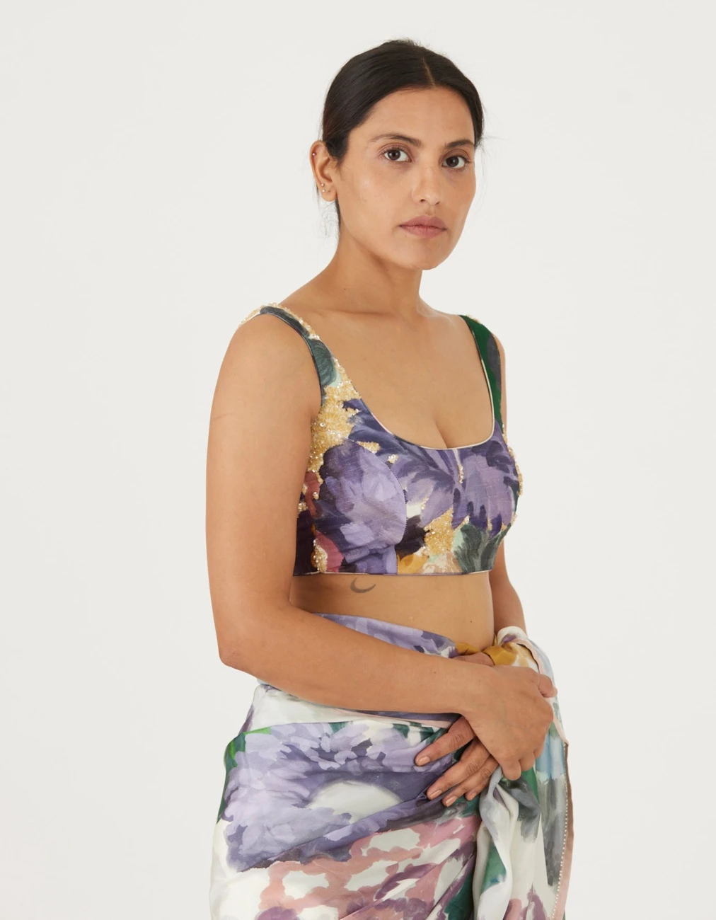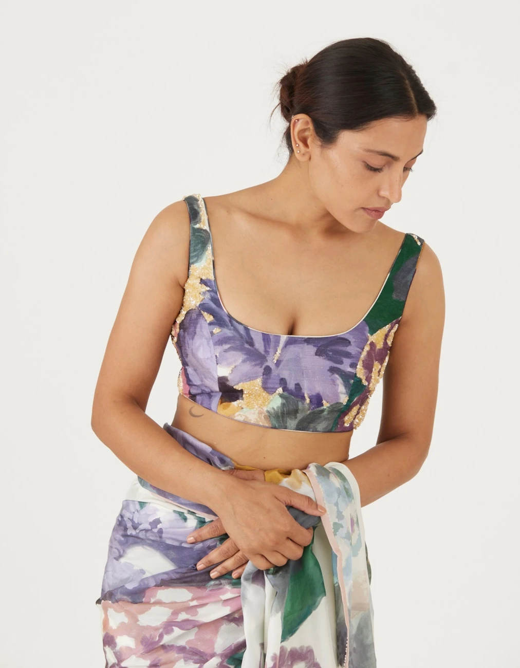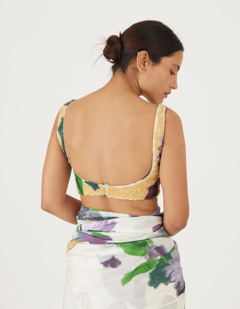 - The blouse is crafted in crepe and fetures hand embroidered sequin work to highlight the print.
