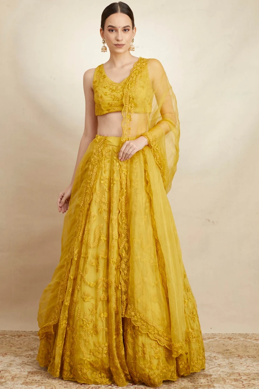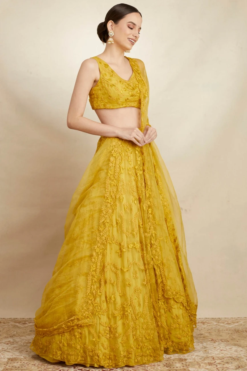- Mustard Organza Lehenga with floral pattern from dori and thread self work