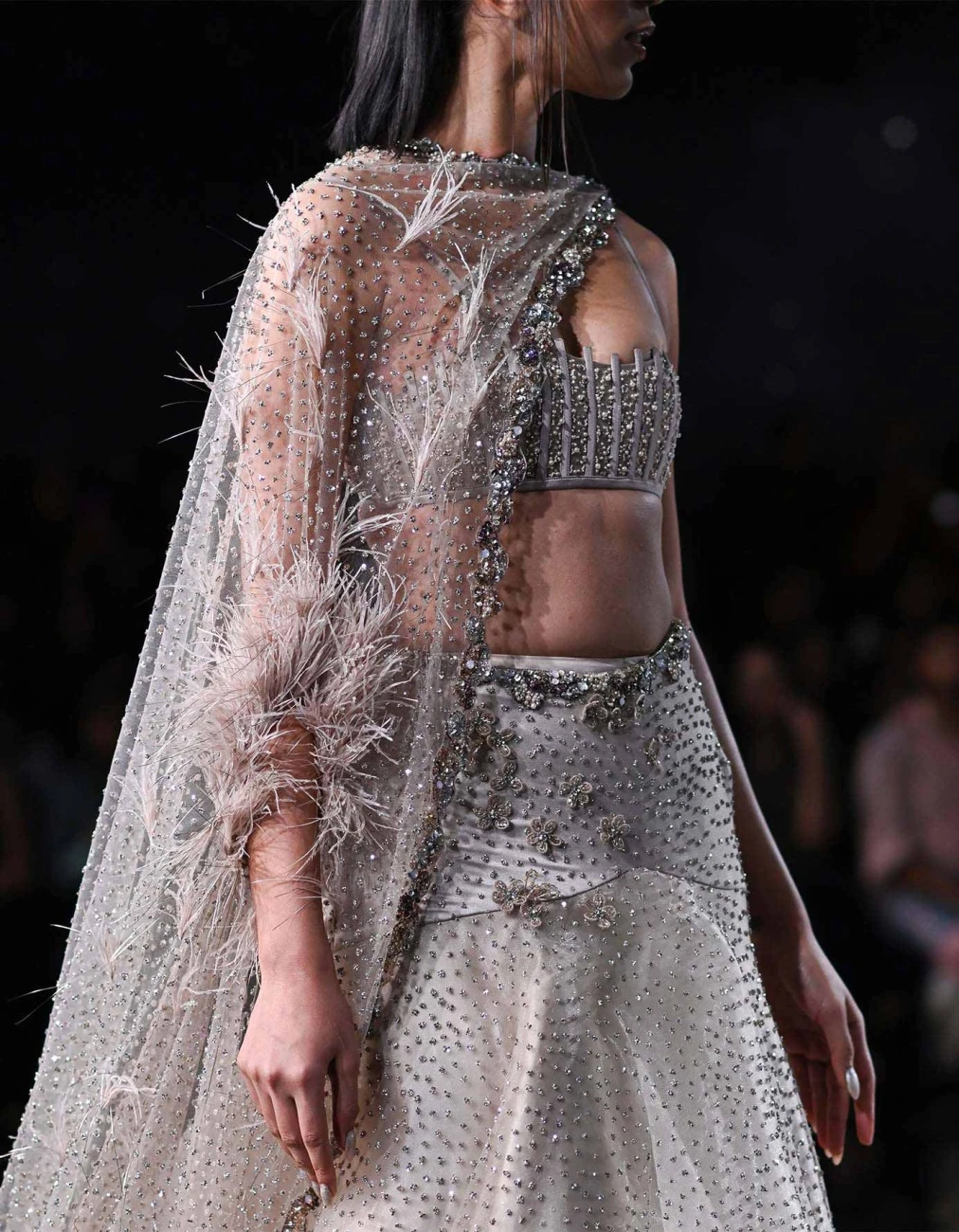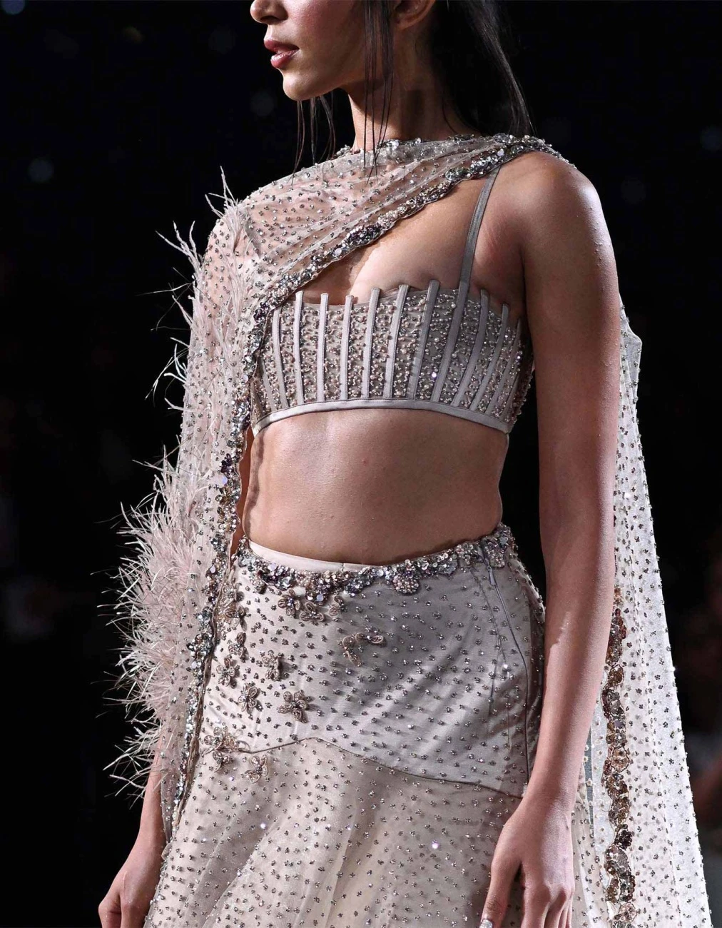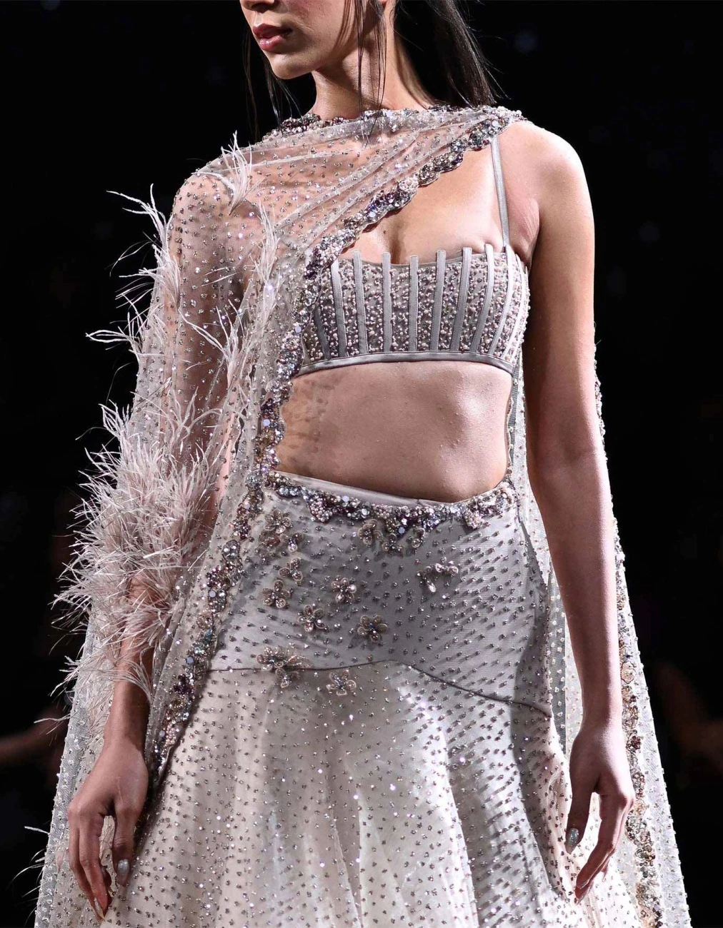 - Dusty copper crystallised tulle lehenga set paired with boned bustier choli and draped dupatta and feathered sleeve detail