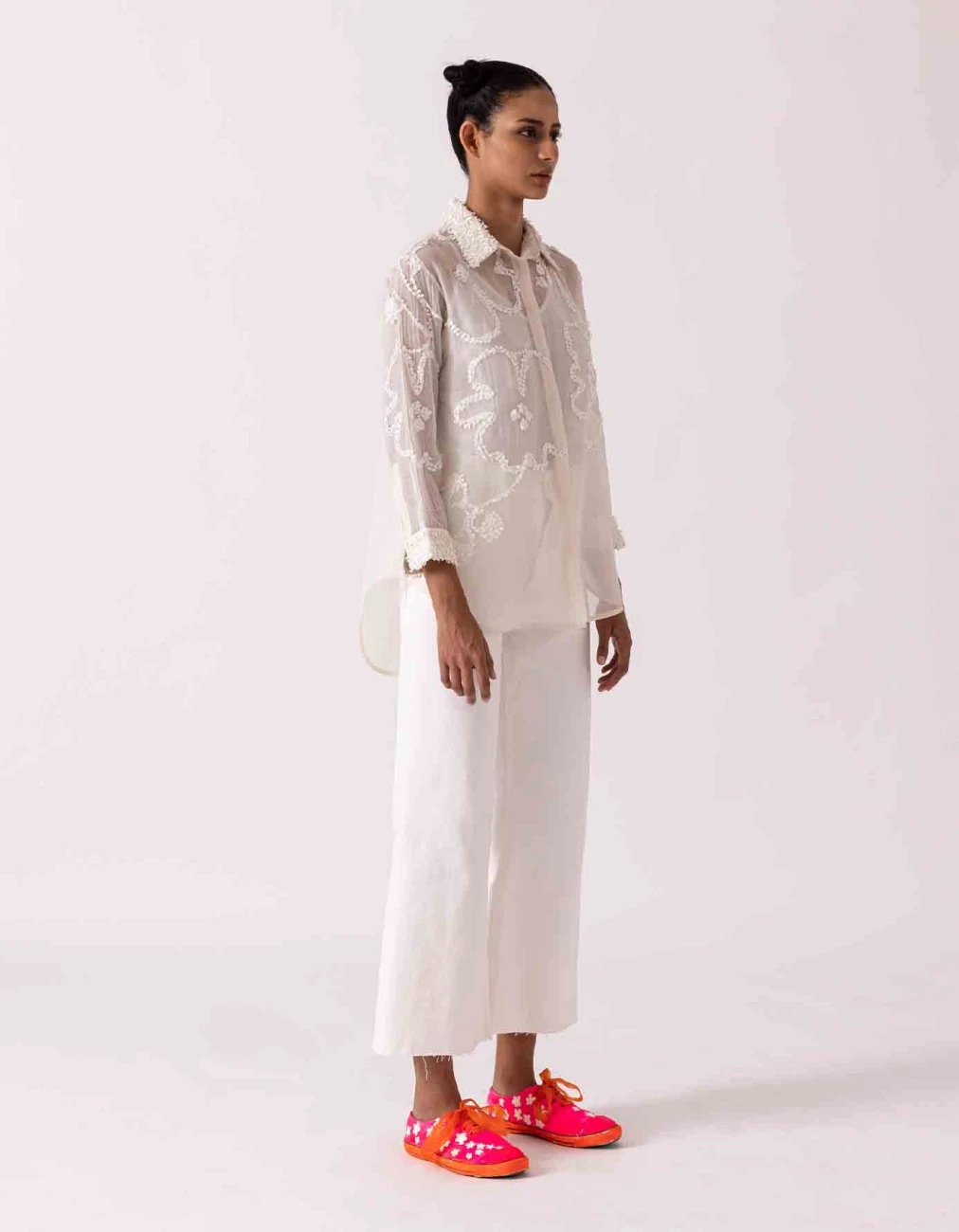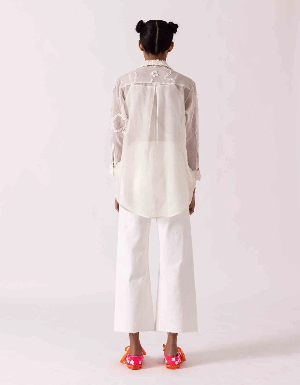 - Coco a sheer shirt with textured floral details in tonal whites for an understated elegant look