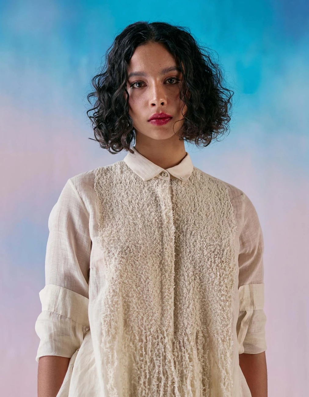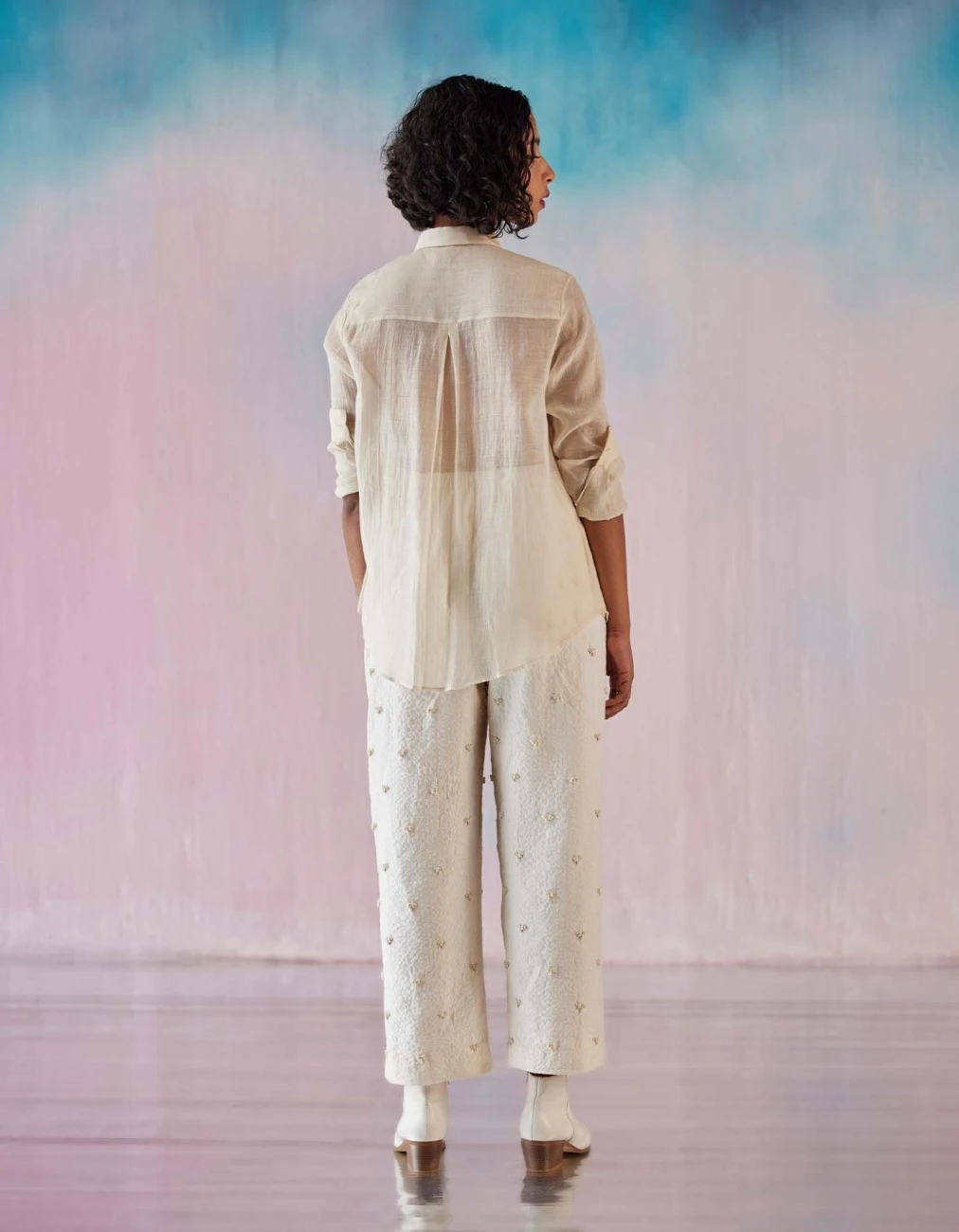 - Off white chanderi moss emb yoke fringe shirt