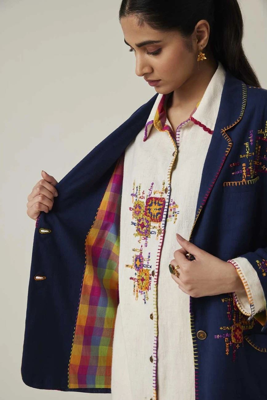 - The intricate multicoloured crocheted knitted patches and blocks are stitched on different parts of the shirt