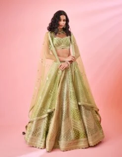 - Multi Shaded Zari Dori Embroidered Raw Silk And Brocade Lehenga Set With Net Dupatta.