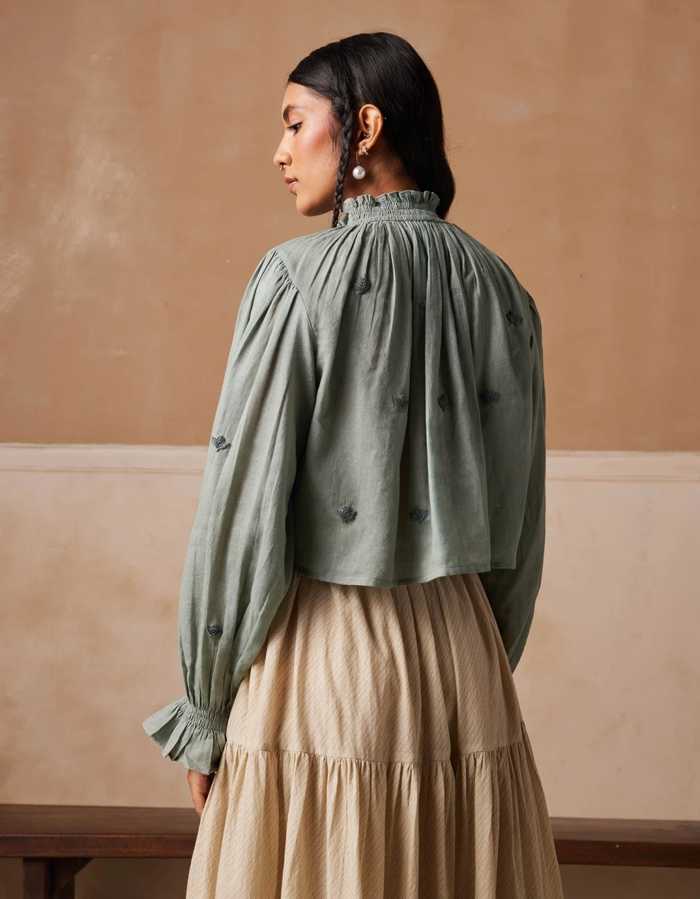 - It features smocking on the neck and the cuffs, the cuffs are elasticated and the length is cropped for the relaxed fit