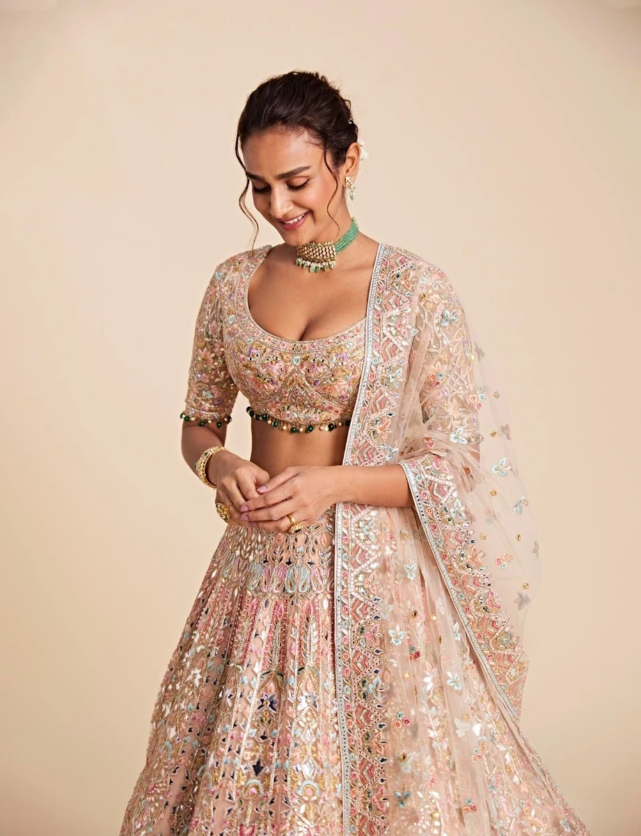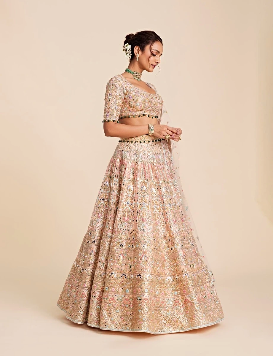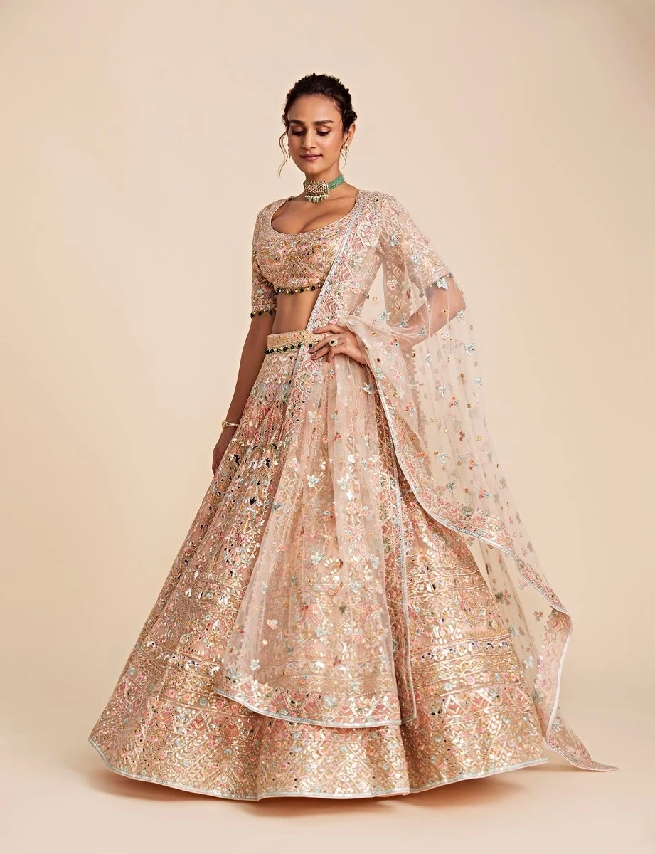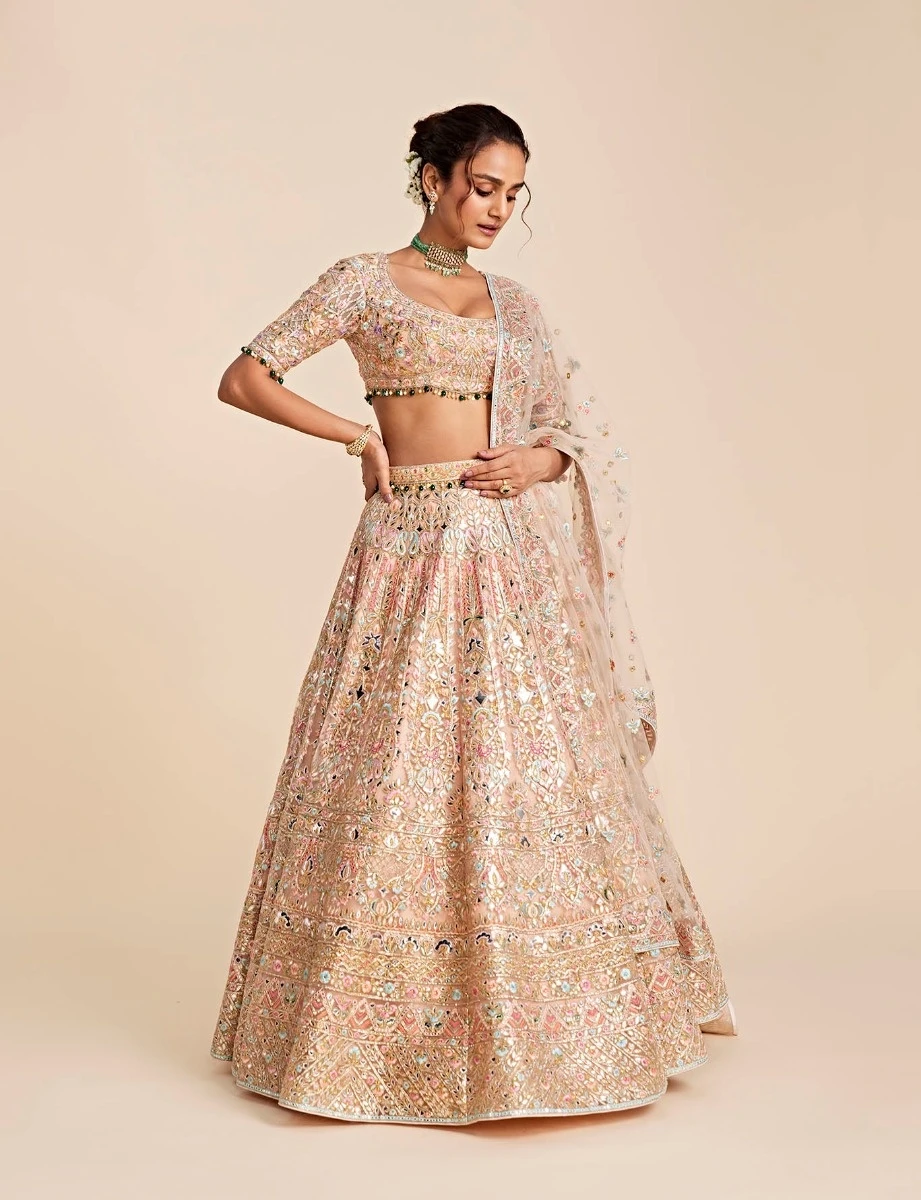 - Peach tulle lehenga set with intricate self and multi hued resham embroidery, gota, foil, mirror, embroidery