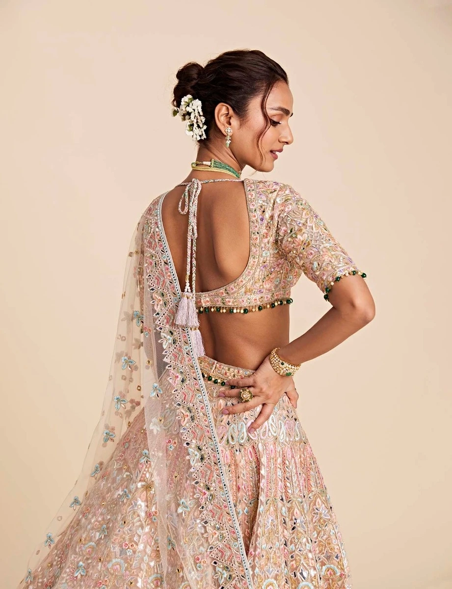 - Peach Tulle Lehenga Set With Blue, Pink and Peach Embroidery