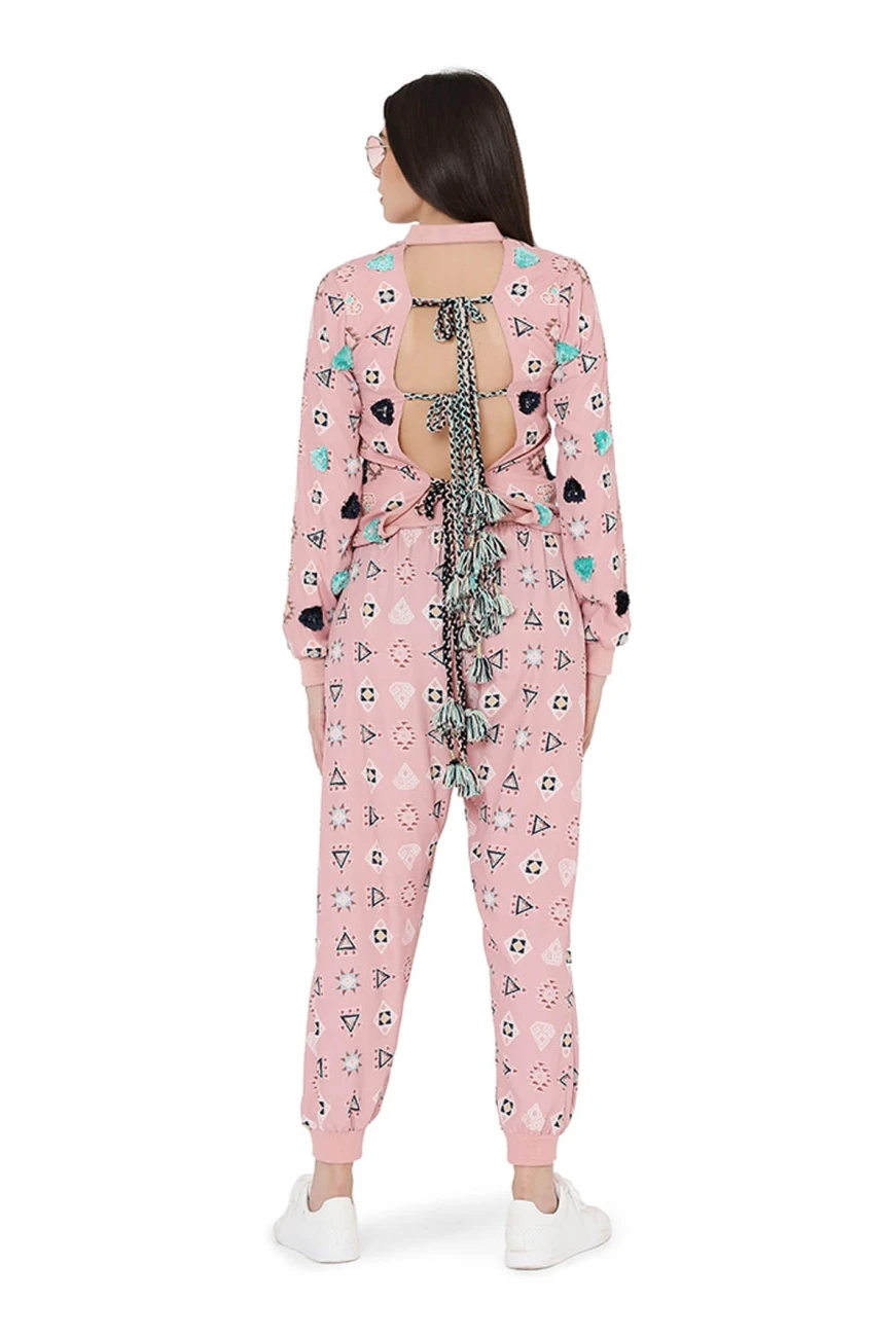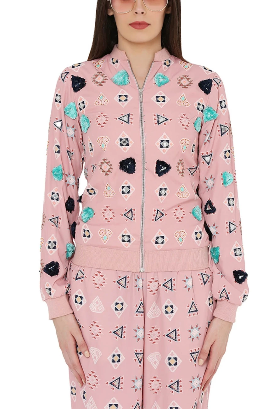 - Pink warli aztec print art crepe embroidered back tie-up bomber jacket