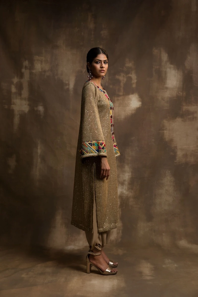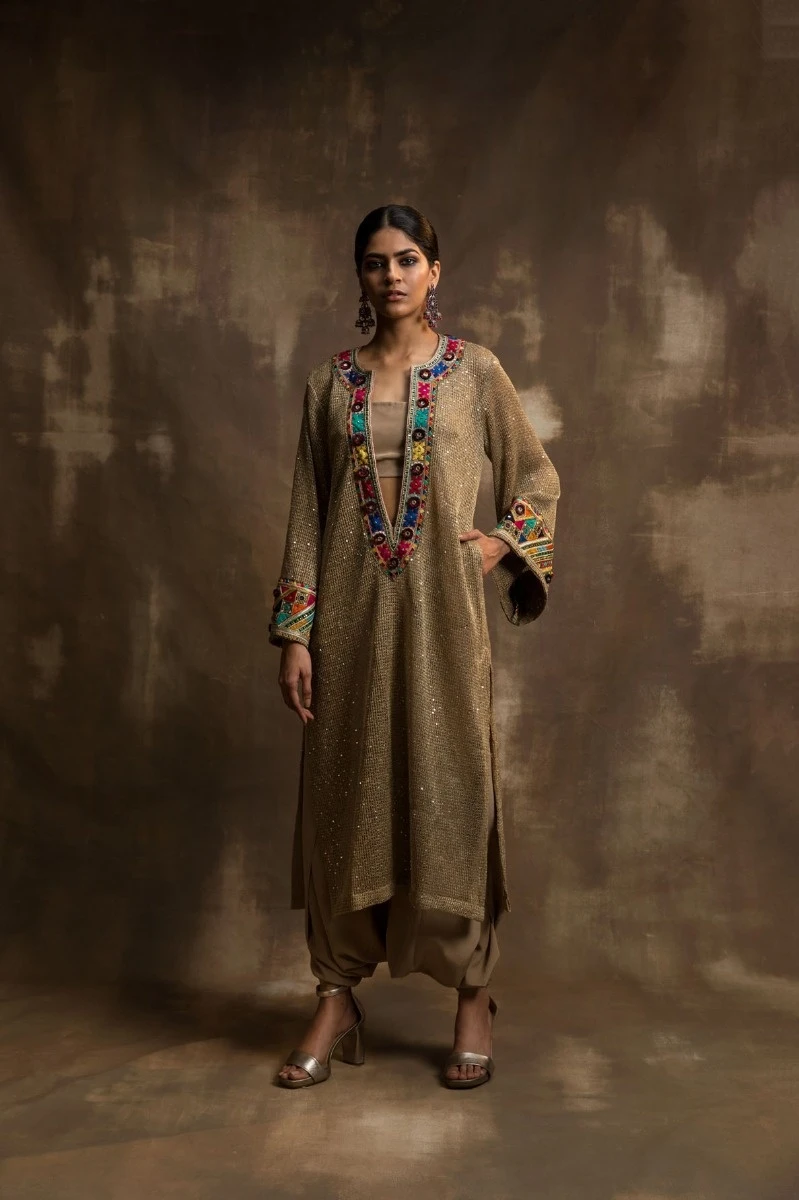 - Fabric – woven silk kurta, crepe blouse and dhoti