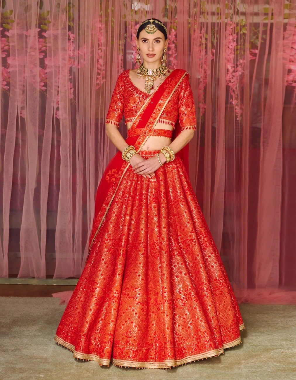 - Red Brocade Applique and Thread Work Lehenga Set