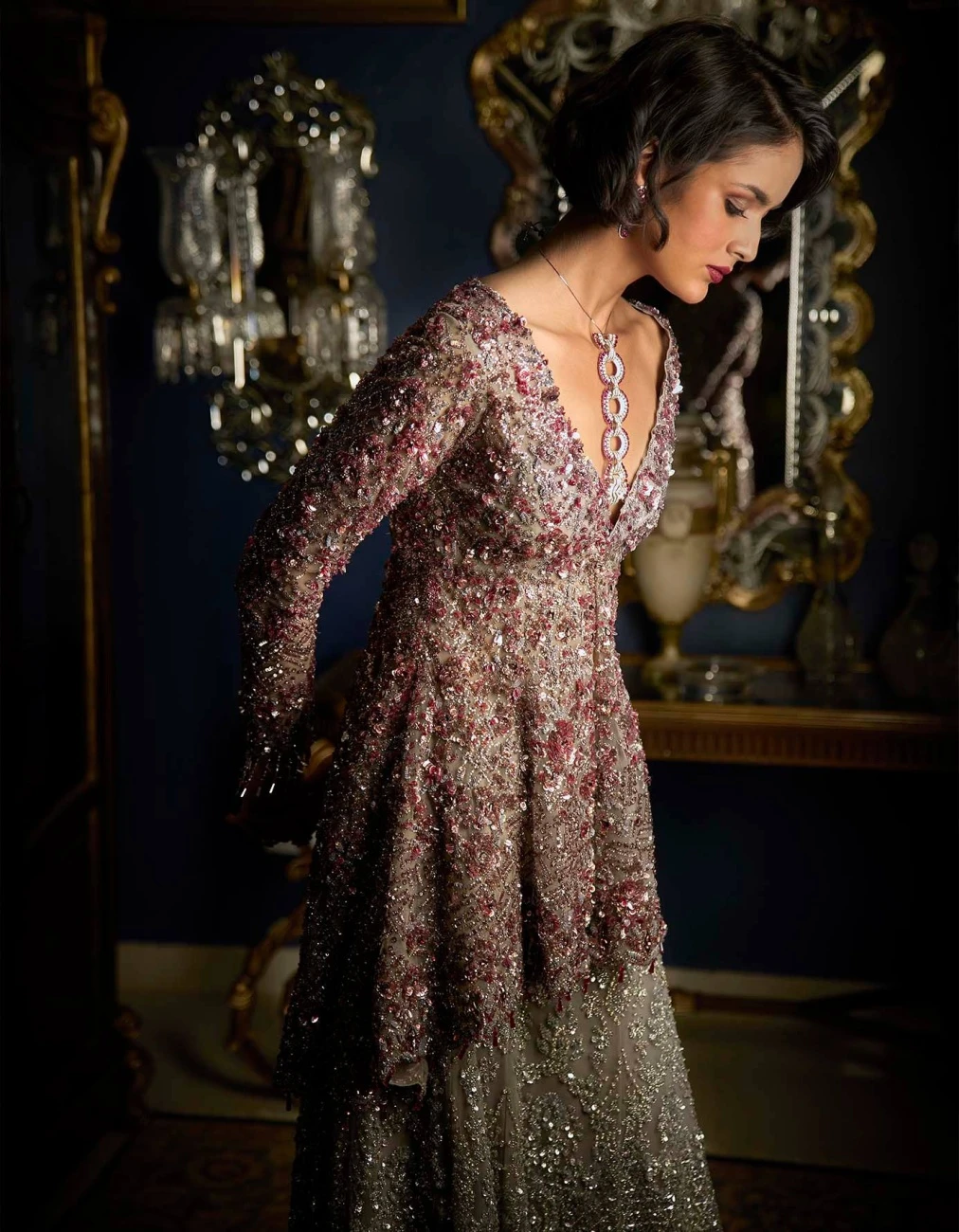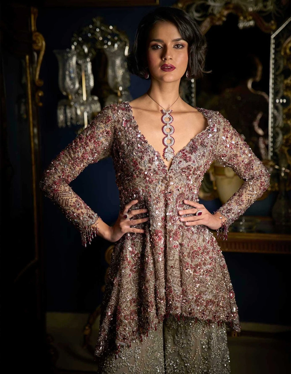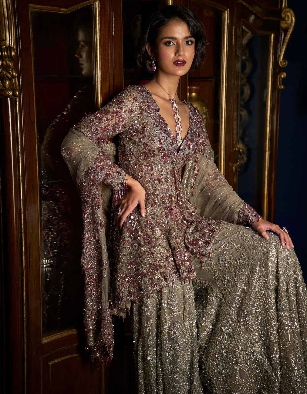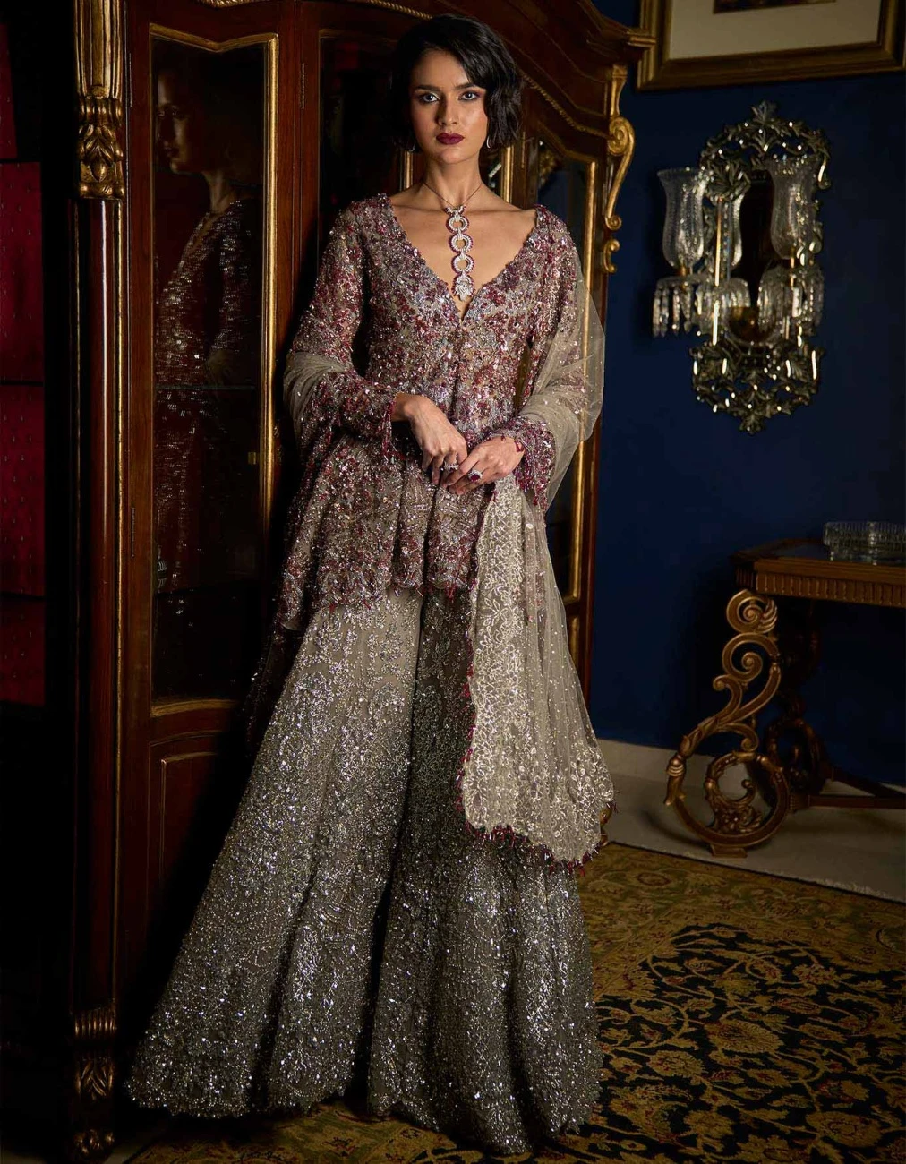 - This high-low sharara set features intricate embroidery in sequin, beads and crystals