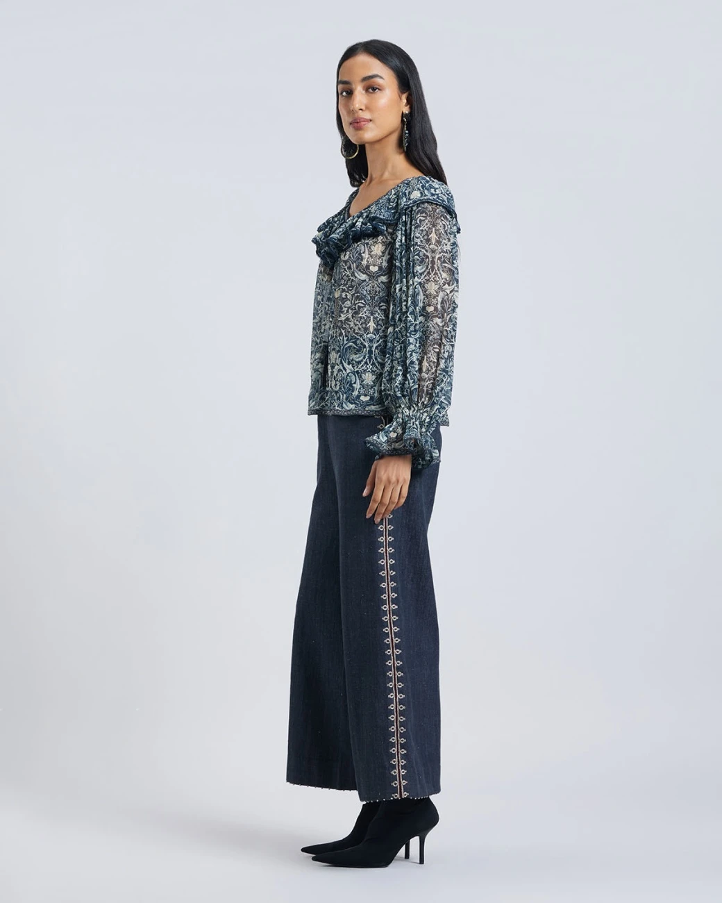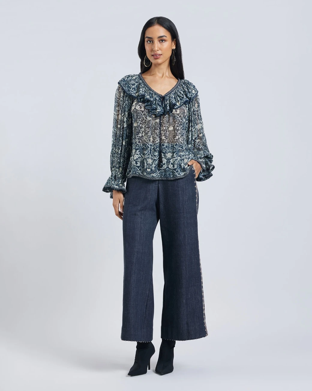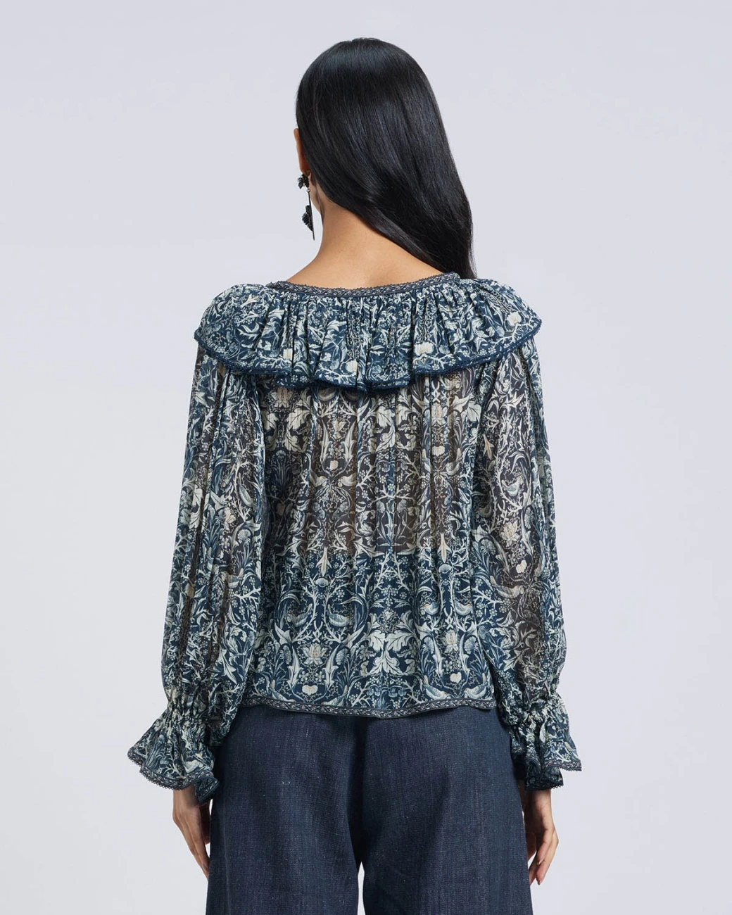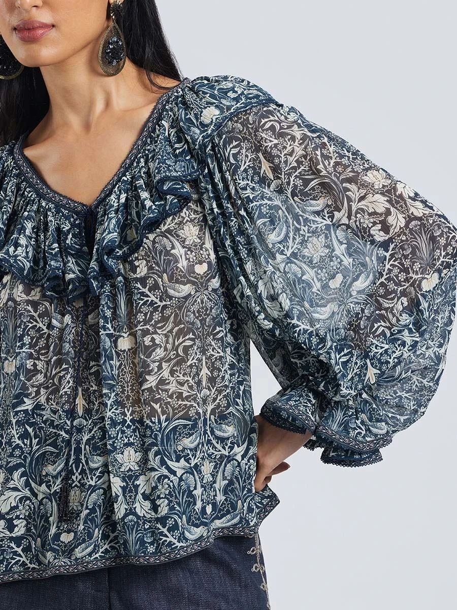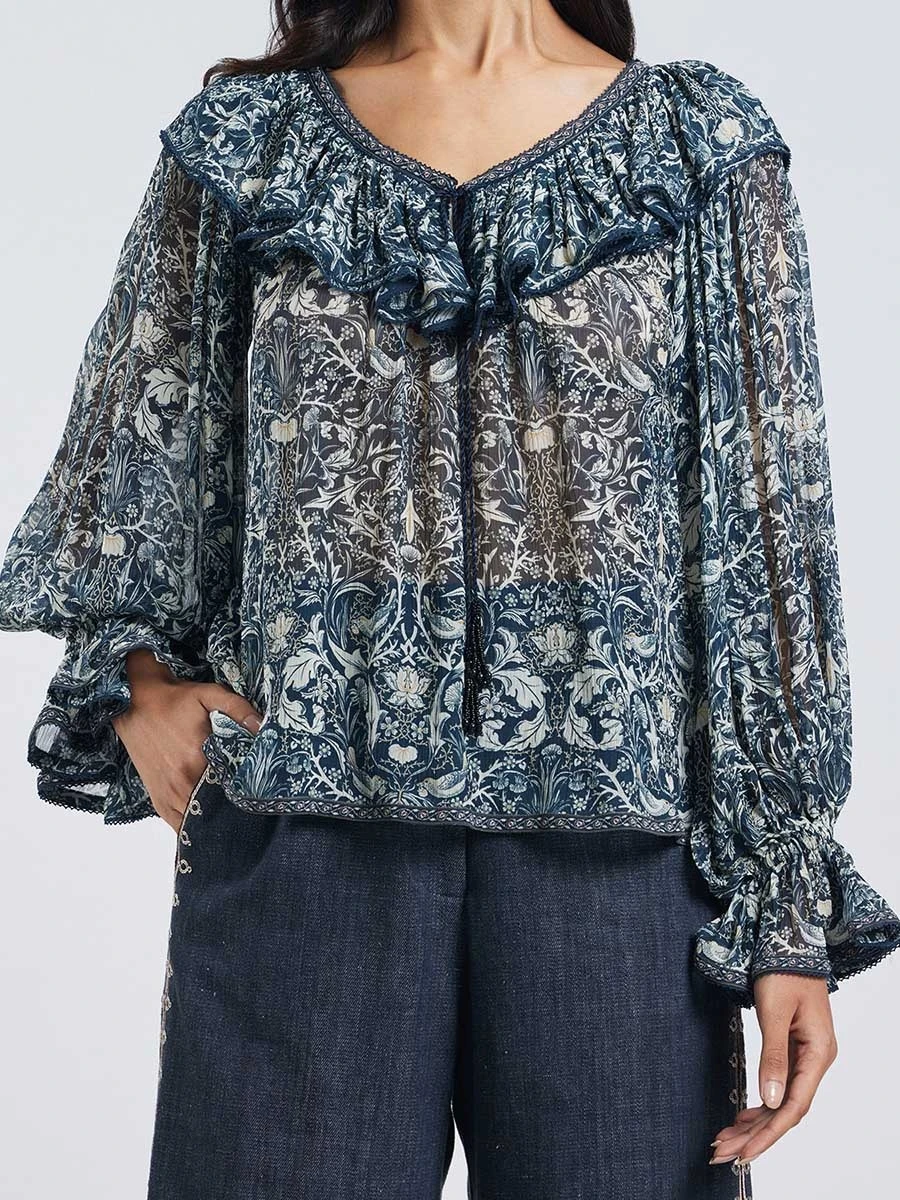 - Our crinkled silk chiffon blouse is adorned with exquisite botanical motifs inspired by Art Nouveau and the influence of William Morris.