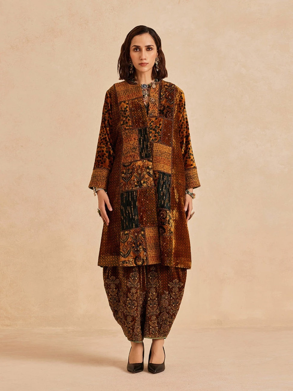 - Featuring embroidered cowl ijar- hand-block ajrakh print using natural dyes, finished in modal silk in bagru hand-block print