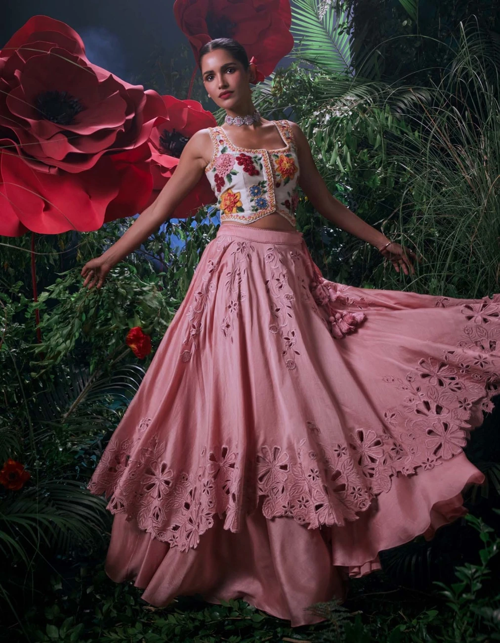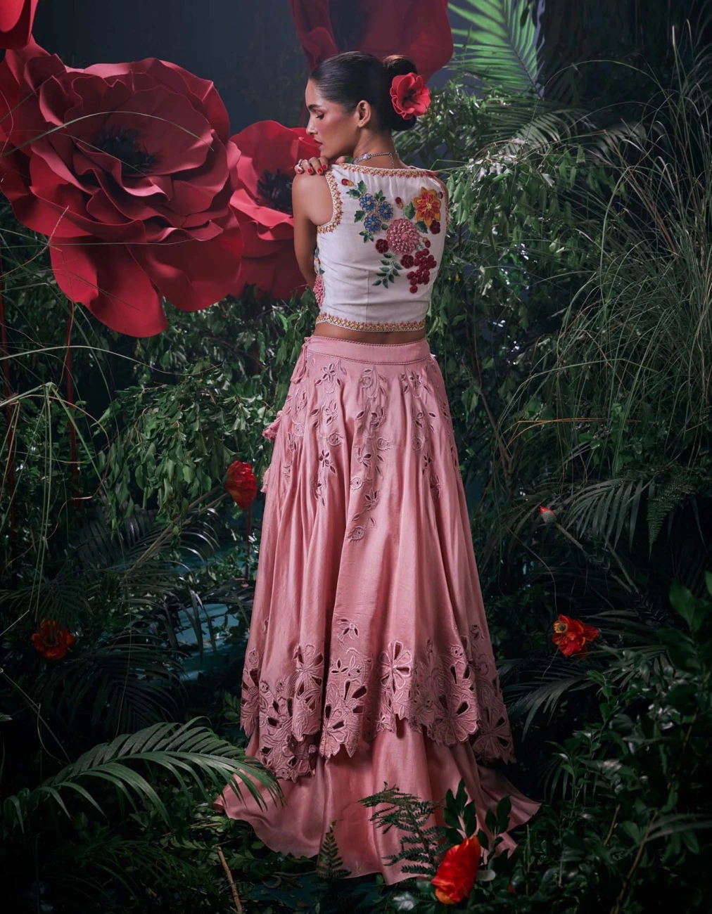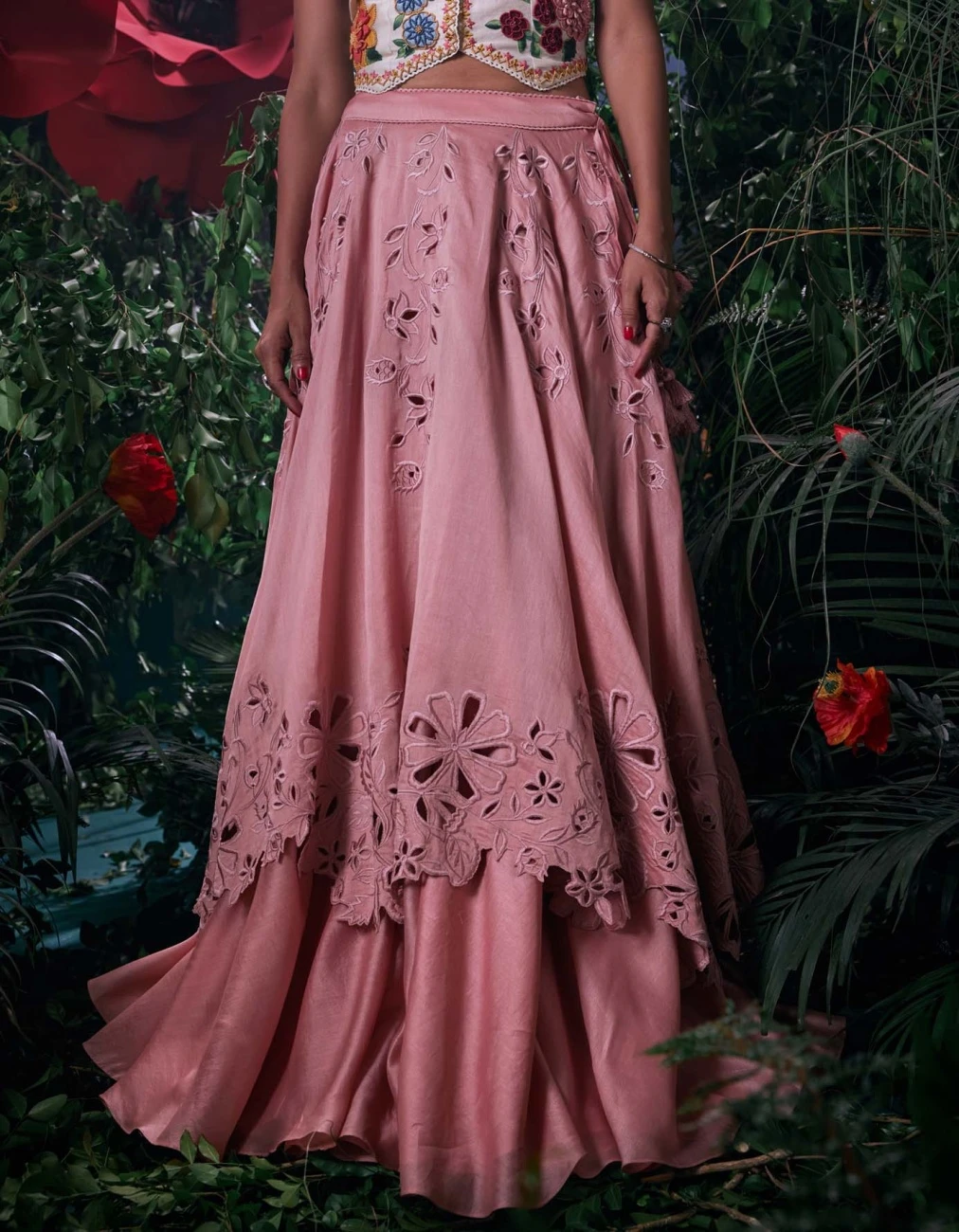 - Salmon Pink Chanderi Tonal Cutwork Layered Lehenga